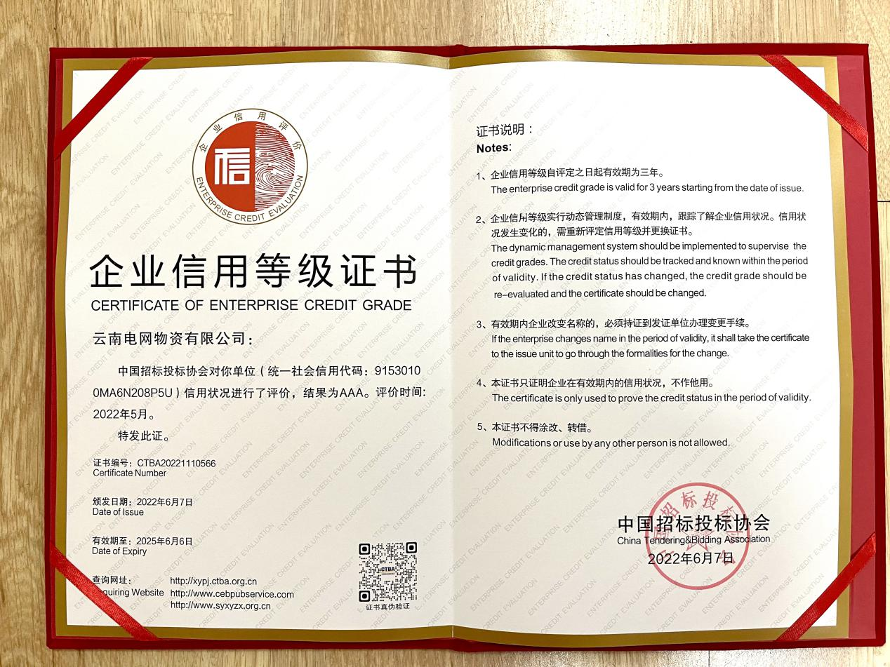 招标代理机构信用等级是中国招标投标协会商业信用中心对企业信用度划分的“三等五级”,它反映出企业信用度的高低,其中AAA级为最高等级。云网物资公司就企业基本信息、经营管理信息、财务状况信息、公共信用信息、行业评价等方面开展梳理申报,最终取得该项认证。