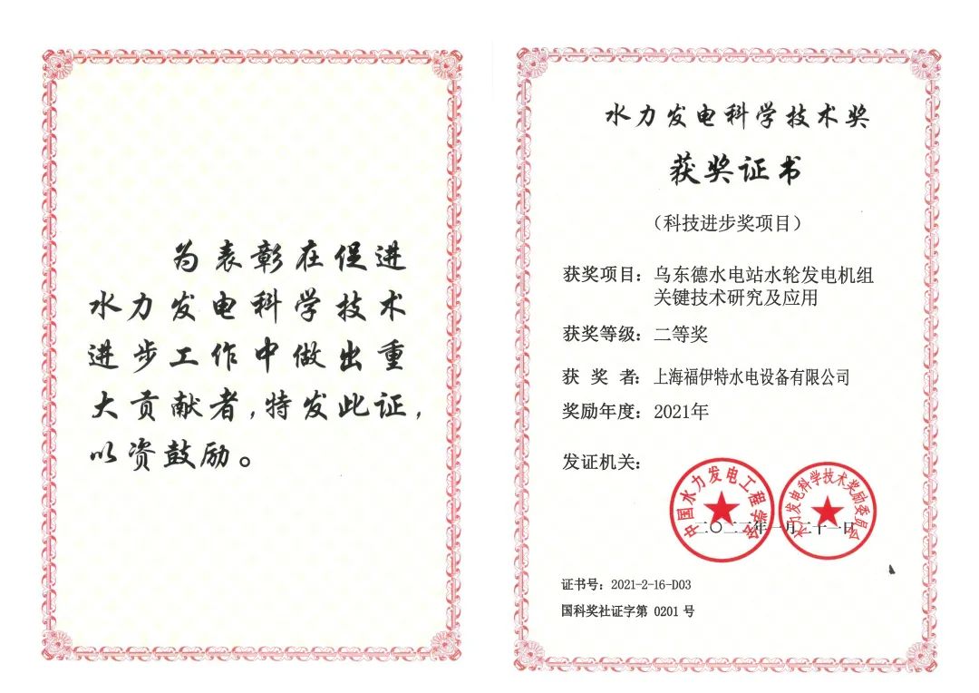 由于在乌东德水电站水轮发电机组关键技的重大突破及运行的卓越性能,福伊特同时荣获了中国水力发电工程学会颁发的水力发电科学技术类—科技进步奖项,该奖项是水力发电设备在该年度评选的最高奖项。