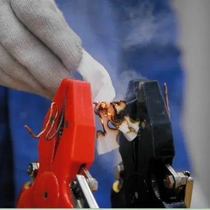 ”短路失火演示”——实验用一台可以产生较大电流的电流源模拟家用电源,用一段曲型铜线模拟家庭线路中的短路缺陷,用纸巾来代替缺陷附近的易燃物。