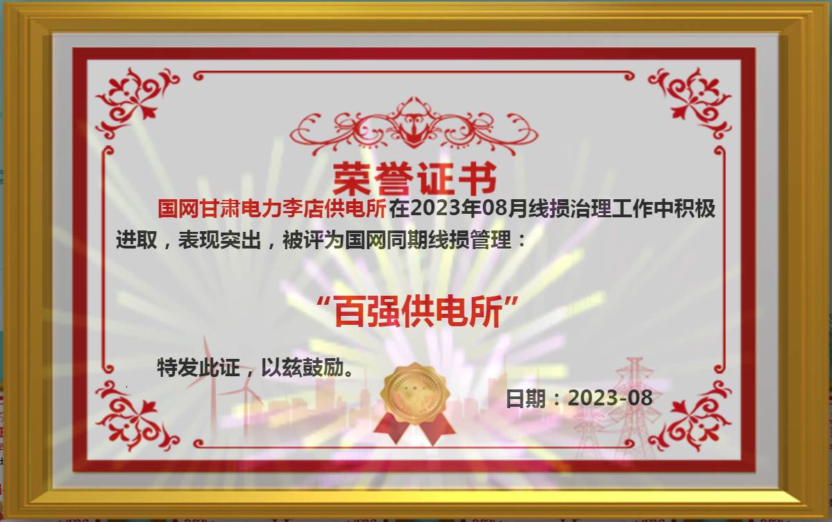 中国能源新闻网讯(成世杰 张军娥)“喜报、喜报!国网甘肃电力李店供电所在2023年8月线损治理工作中积极进取,表现突出,被评为国网同期线损管理百强供电所。”9月14日,在国网甘肃省电力公司通渭县供电公司线损业务联系群中,国网“百强供电所”的荣誉证书,一下子将工作群热闹了起来。此次该公司李店供电所以全国并列第一的成绩入围“百强”。