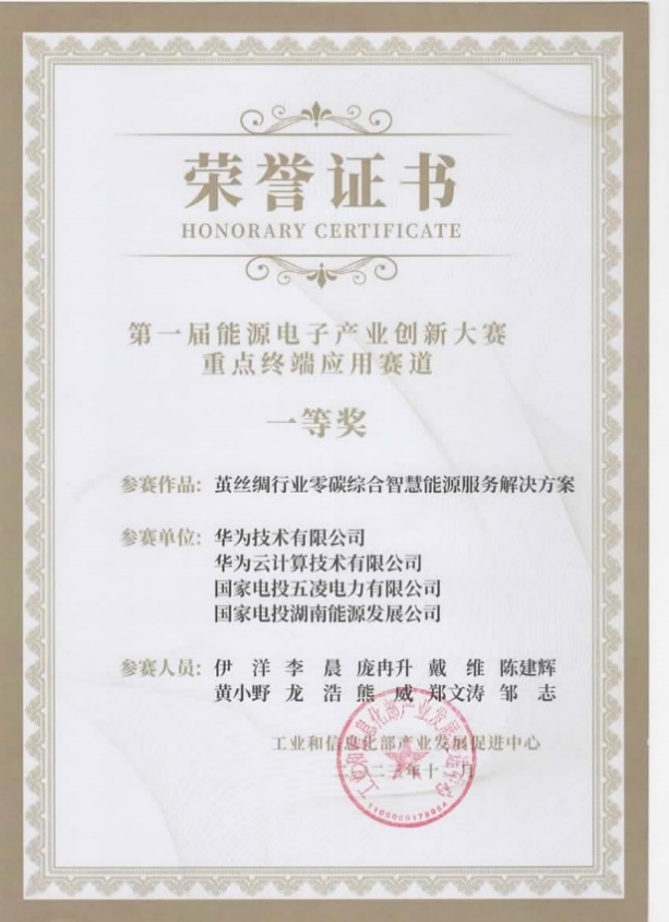 12月16日,由工业和信息化部产业发展促进中心举办的第一届能源电子产业创新大赛新型储能产品及重点终端应用赛道颁奖仪式在江苏溧阳举行。作为全球领先的ICT(信息与通信)基础设施和智能终端提供商,华为技术有限公司作为牵头单位申报的《茧丝绸行业零碳综合智慧能源服务解决方案》(以下简称“方案”)致力于整体降低茧丝绸企业用能成本,提供绿色茧丝绸中国方案,最终获得专家评委的充分肯定并斩获一等奖。
