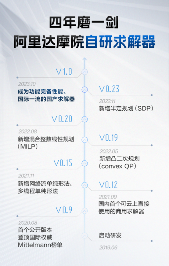 据了解,阿里达摩院决策智能实验室在国际知名数学家印卧涛带领下,自2019年起就致力于求解器研发,从零起步,经历四年、迭代26个版本,终于在2023年10月正式推出V1.0版本,成为功能完备、性能领先的自研求解器。目前,达摩院求解器已能求解包括线性规划、混合整数线性规划、大规模网络流、凸二次规划、半定规划、非线性规划在内的主流优化问题,并且具备针对聚焦领域的AI加速能力。