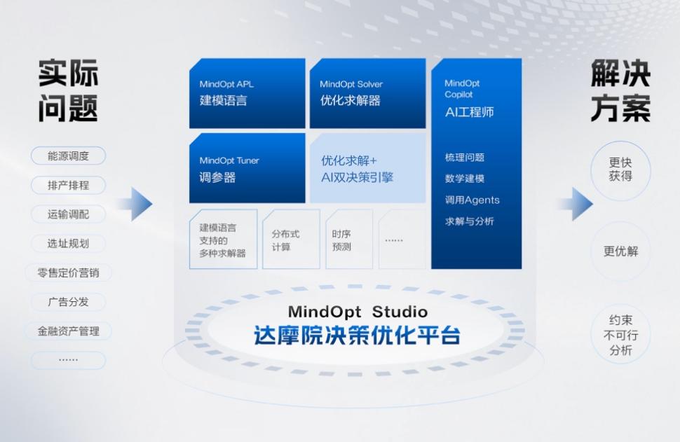 同时,达摩院还不断突破求解器原有框架,结合中国工业场景的现实需求,相继推出了自研建模语言、调参器、优化平台。今年8月,打造决策推理大模型,上线具备数学优化技术能力的AI工程师MindOptCopilot。用户无需了解复杂的数学或编程知识,直接使用自然语言提问优化问题,即可由MindOptCopilot自动数学建模,将问题转化为线性规划和混合整数线性规划的优化模型,并编码和调用软件,计算出最佳答案。达摩院决策智能实验室负责人印卧涛表示:“从4年前起步的时候,达摩院求解器就把目标定为下一代的技术,而不是仅仅是追赶国际领先厂商。”