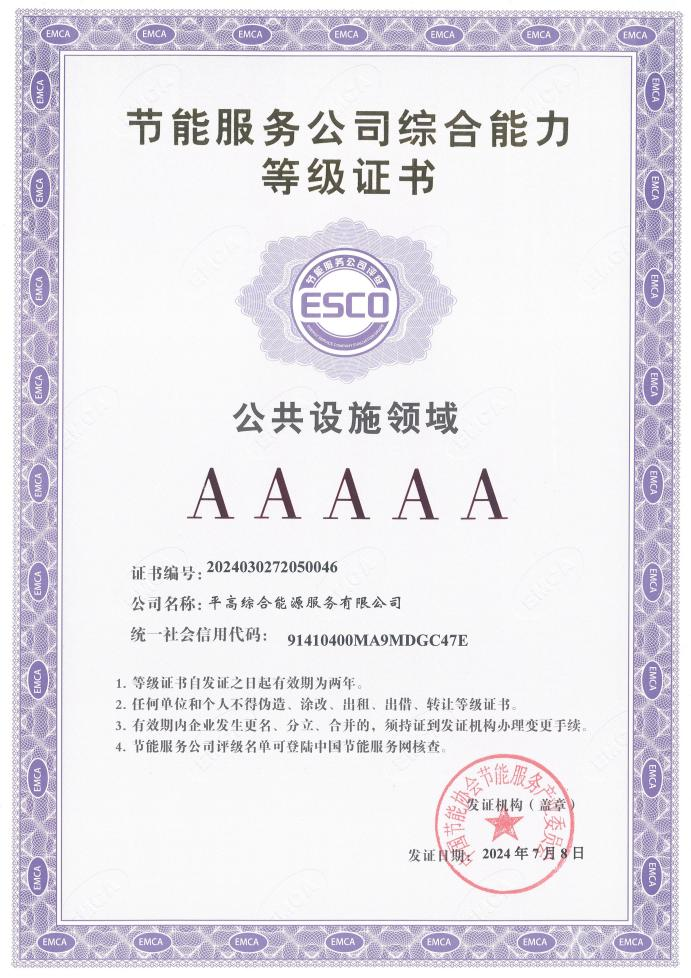 中国能源新闻网讯(杨红亚 郑坤 孙蓓蓓)7月15日,中国节能协会服务产业委员会公布了节能服务公司综合能力评定的结果,平高集团所属平高综合能源服务有限公司(简称“综合能源公司”)获得了节能服务公司综合能力“公共设施AAAAA”级认证证书。
