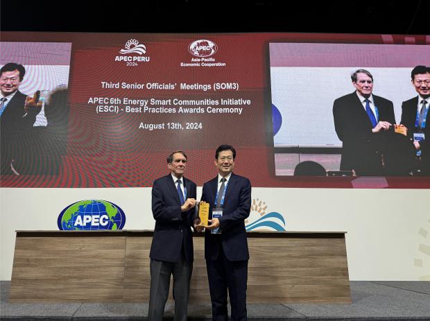 中国能源新闻网讯(黄峰 赵子焕)北京时间8月14日上午7时(当地时间8月13日18时),在秘鲁利马举办的第六届APEC ESCI最佳实践奖颁奖典礼上,国家电投集团浙江电力有限公司(以下简称“浙江公司”)湖州综合智慧能源项目获评第六届亚太经合组织(APEC)能源智慧社区倡议(ESCI)最佳实践奖 低碳城镇类别(LCMT)银奖。这也是中国首次在该平台获得的低碳城镇类别奖项。浙江公司党委书记、董事长李强上台领奖,国家电投国际业务部副总监成晓虹作专题发言。