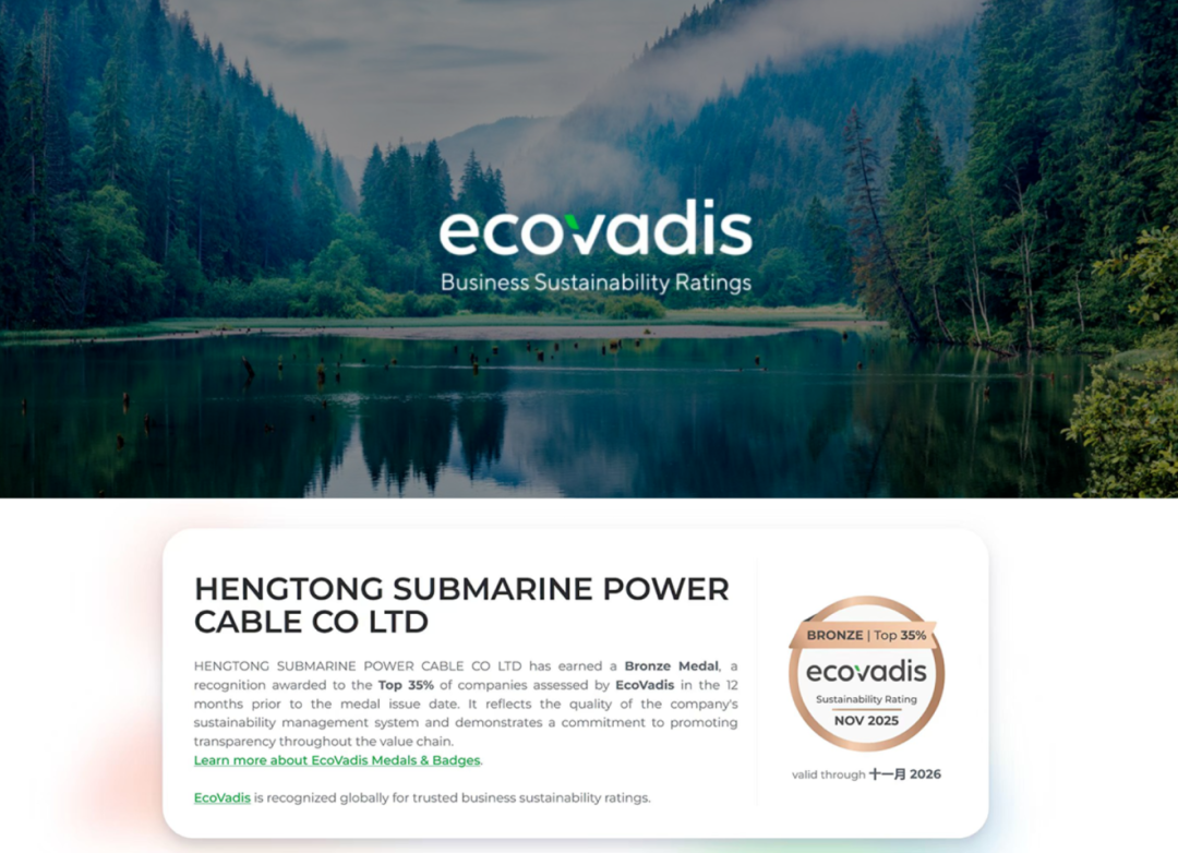 中国能源新闻网讯(华轩)近日,全球公认的企业社会责任(CSR)绩效评估权威机构EcoVadis正式公布最新评级结果,江苏亨通高压海缆有限公司(以下简称“亨通高压”)凭借在环境管理、社会责任、商业道德及可持续供应链等方面的卓越表现,核心指标处于全球行业领先地位,荣获EcoVadis较高评级奖牌。