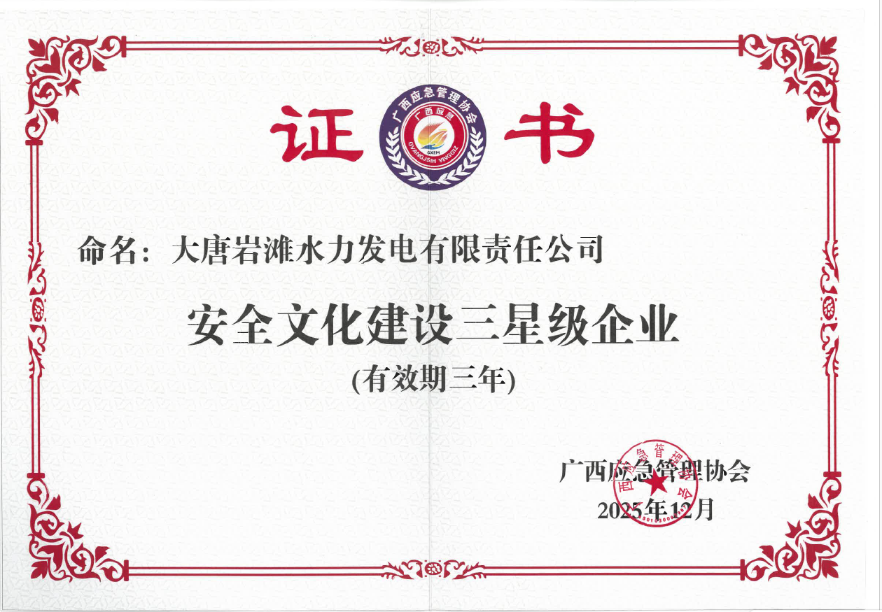 2025年1月9日,大唐岩滩水力发电有限责任公司(简称“岩滩水电公司”)捧回了荣誉证书。凭借扎实过硬的安全管理成效,经广西应急管理协会严格评审,该公司正式被命名为“安全文化建设三星级企业”,跻身广西首批获此殊荣的水电企业。