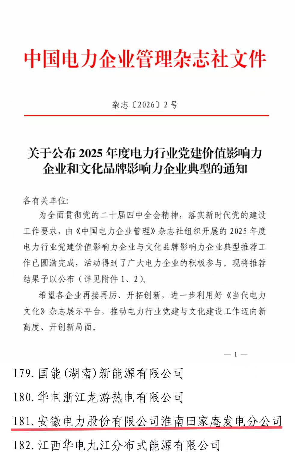 中国能源新闻网讯(李军)1月21日,大唐安徽淮南田家庵发电分公司(简称“大唐田家庵发电”)凭借创新实践的“传承红色基因 打造红色田电”党建品牌体系,以及党建与生产经营深度融合的突出成效,成功获评中电联“2025年度电力行业党建价值影响力企业典型”。这一殊荣,彰显了该公司在党建铸魂、品牌塑形等方面的行业影响力。