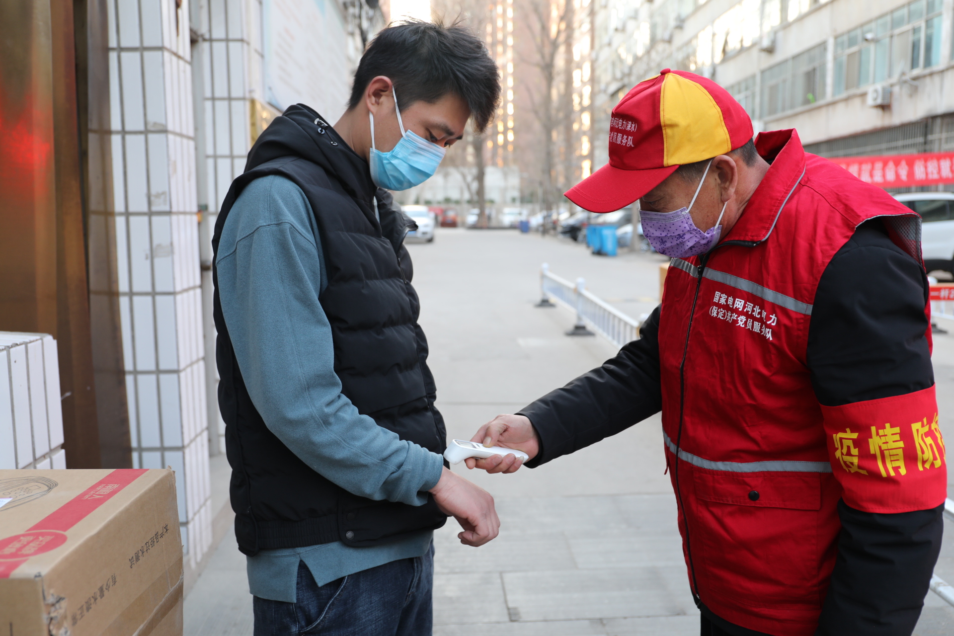 正在涞水县泰安路电力小区疫情防控卡点执勤的丁士义,认真地用额温仪给下班回家的同事邵文录测温。