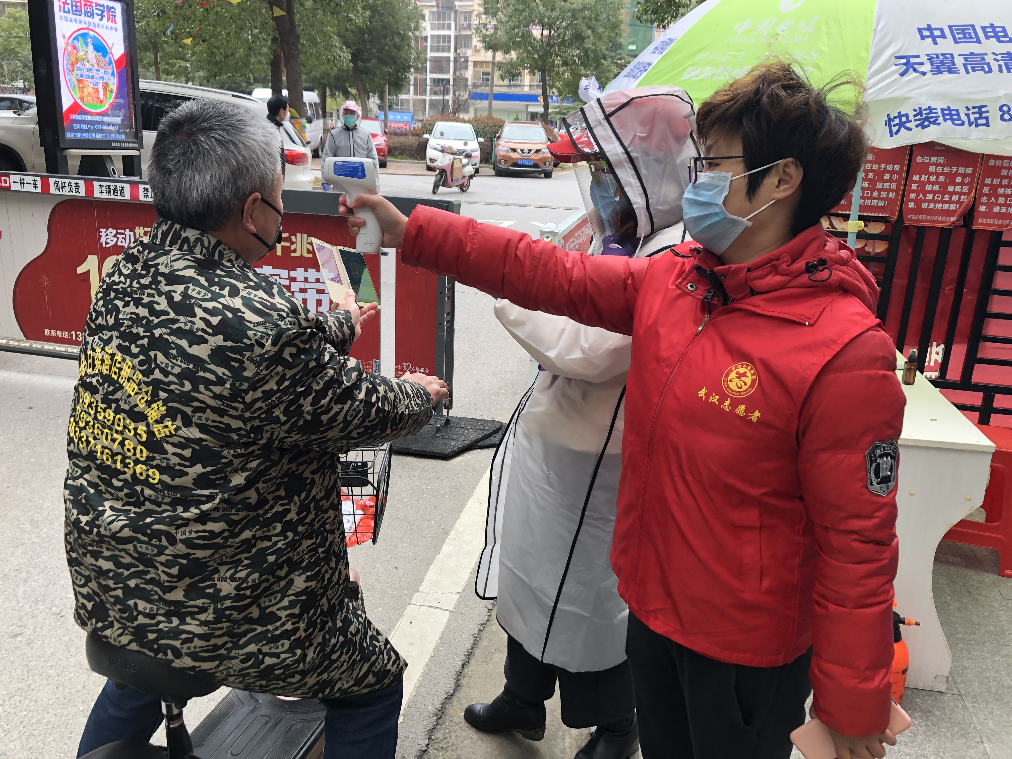 黄莉娜在对出入居民测量体温