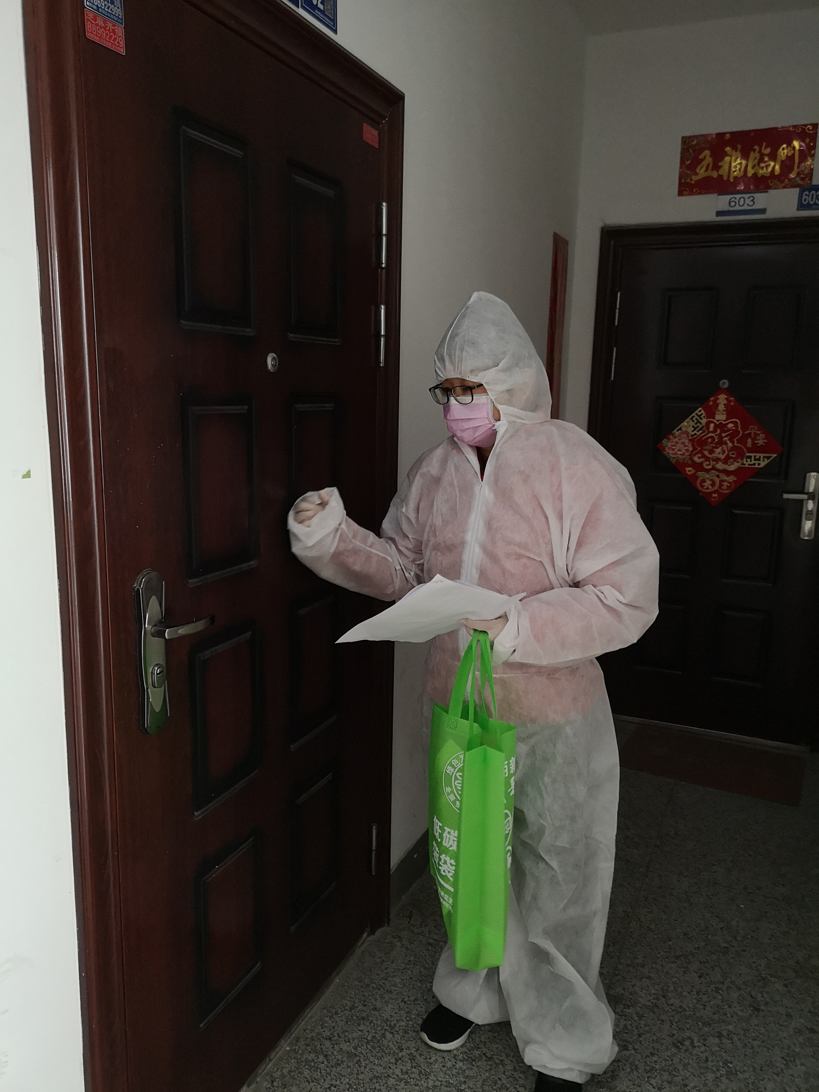 在落实“五个百分之百”工作目标,遏制疫情扩散的社区大排查中,黄莉娜跟随社区工作者刘姐,除了利用微信、QQ进行线上和电话联系外,还对线上未反馈和无法联系的居民,以及有确诊病例的单元,挨家挨户上门进行摸底排查。一天下来,黄莉娜不知道重复了多少句:“您好,有人在家么,我们是社区的服务人员”“现在您家里有几个人在家?”“家人身体怎么样?”“今天测了体温没有,数据是多少?”……说的口干舌燥,但是为了能在规定期限内完成排查,顾不得喝水,也不敢喝水。一是时间紧任务重,二是防护服不方便穿脱,三是为了节约防护服。一旦开始排查,她就只能趁吃饭的时间喝水,但有时候,下午两三点,晚上八九点钟才能吃上午饭和晚饭。一天下来,小腿肚子和指关节都有点发肿,回到家里坐下来就不想动,话也不想说。三天排查工作结束之后,黄莉娜又到小区疫情监控点进行值班,每天对来往车辆、出入人员进行体温监测和检查登记。