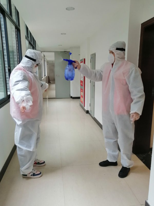 图为:在清理完所管理的楼层后,杨长春拿着酒精给同组志愿者进行消毒