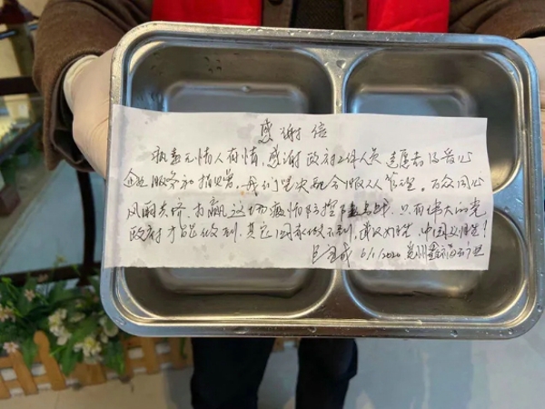 杨长春所在的遵义干部学院以工作组的形式24小时分组倒班。每天早上8点钟,杨长春穿着防护服,拿着消毒液就会对所管理楼层进行全面消毒,然后来到每个房间进行消毒、清理垃圾,给隔离人员送早饭,送水,收餐具。每天要负责排查隔离人员身体情况,做好体温测量和登记,对新送到的隔离观察人员进行登记、疏导、筛查及引导,空闲时间还要负责楼道卫生保洁、以及物资配送。当听说有隔离人员的小孩在房间闹腾要出去玩时,他就给孩子找了几本书和一些纸和笔,送到小孩的房间,“小朋友,病毒就守在咱们学校外面,他肚子正饿着,你现在要是出去它正好可以美餐一顿,你想不想成为它的午餐呢。”小孩这么一听,顿时打消了出去玩的想法。“您好,今天有没有乏力、咳嗽症状呢?”“您好,如果您需要什么物资,可以告诉我,我去帮您拿。”隔离区的工作量大且责任重,有时被隔离人员情绪波动,杨长春总是笑语相对,耐心劝导和解释,用细心体贴的服务去缓解隔离人员的情绪。现在被隔离人员经常会以各种“特殊方式”点赞志愿者团队,有时是高高竖起的大拇指、有时是深深的鞠躬,前不久,他们还在回收的餐盘上收到一封粘贴在餐盘上的感谢信,向遵义市政府和志愿者团队表达感谢之情。“感谢政府工作人员、志愿者及爱心企业的服务和捐赠,我们坚决配合服从管理。万众同心,风雨共济,打赢这场疫情防控狙击战......”这是贵州鑫福矿业一位湖南籍到遵打工的包先生被志愿者的爱心和力量所感动,写给遵义干部学院的一封感谢信里的部分内容。疫情期间,他看着志愿者们从天亮服务到天黑,由于长时间穿戴口罩、防护服、护目镜、手套等防护用具,很多人的脸上、手上都长出水泡、湿疹,可志愿者们没有一声埋怨,忍受着手上的瘙痒,将每日三餐送到被隔离者手中。每到一个房间都关切询问被隔离者今日情况,鼓励他们,开导他们,顺利度过一个个的隔离期。