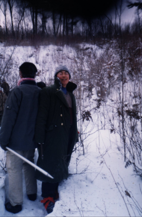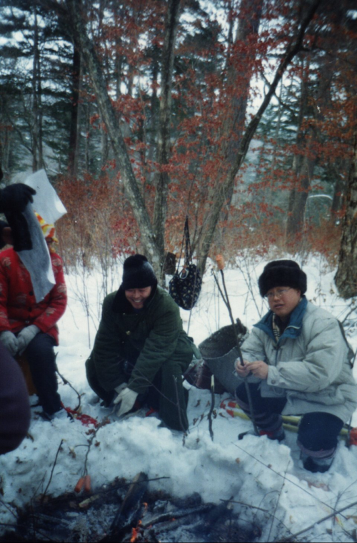 气温低还不是最大的困难,山高、林密、积雪深才是最大的敌人。我行进在队伍最前面,平平常常的积雪深度也到膝盖,遇到有斜坡或者风吹雪的地方,直接到大腿根。有一次我就直接掉坑里没影了,是力工把我拽上来的。走路就更麻烦了,想把脚抬出雪面行走那是办不到的,我只能在雪底下把脚用力伸出去,再膝盖用力前顶,再身体移动,这就算是走出了一步。那运动量,是相当的大,棉大衣从里向外被汗湿透。等到一停下来,小风嗖嗖的一吹冻得直哆嗦,真叫一个透心凉。每一天都在这样的状态中循环反复。极低的温度那是有相当的威力,棉大衣的里怀兜里揣的矿泉水,都冻上了冰碴。同样在里怀兜揣的午饭:面包和火腿肠,也都冻硬了,中午需要在篝火上烤了才咬得动。文后图片1、2可略窥当时境况,感谢照片拍摄者孙斌(彼时电网线路组成员,已离开设计院)。