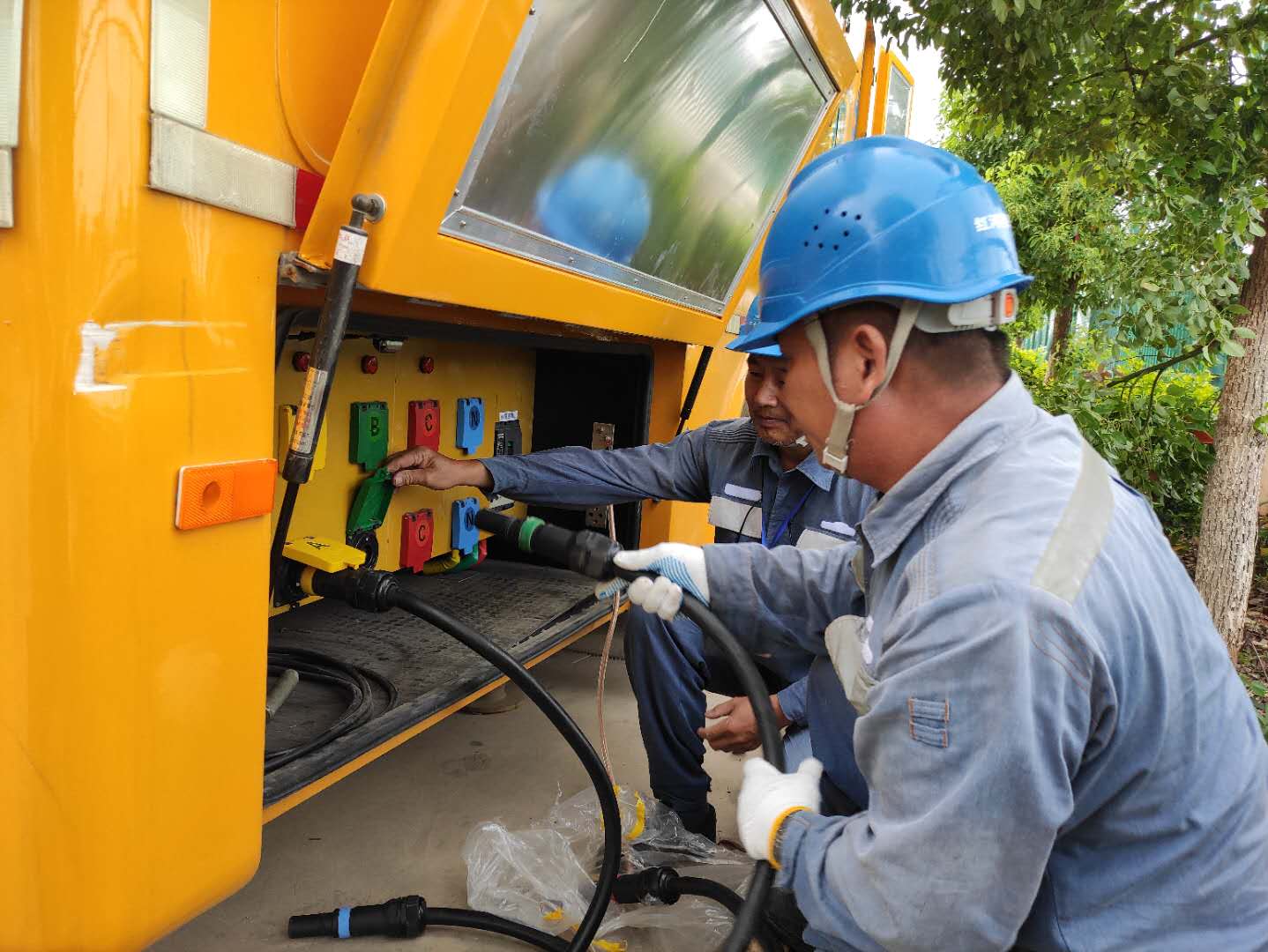 上午七点多,李荣平就和同事来到高考保供电点的红河县第一中学,对相关线路和设备进行再次检查,而在之前他们就已经完成了对配电变压器、配电柜、高低压电缆及校园广播音响系统的全面检查和应急发电车、发电机接入工作调试以及相应应急操作实训。