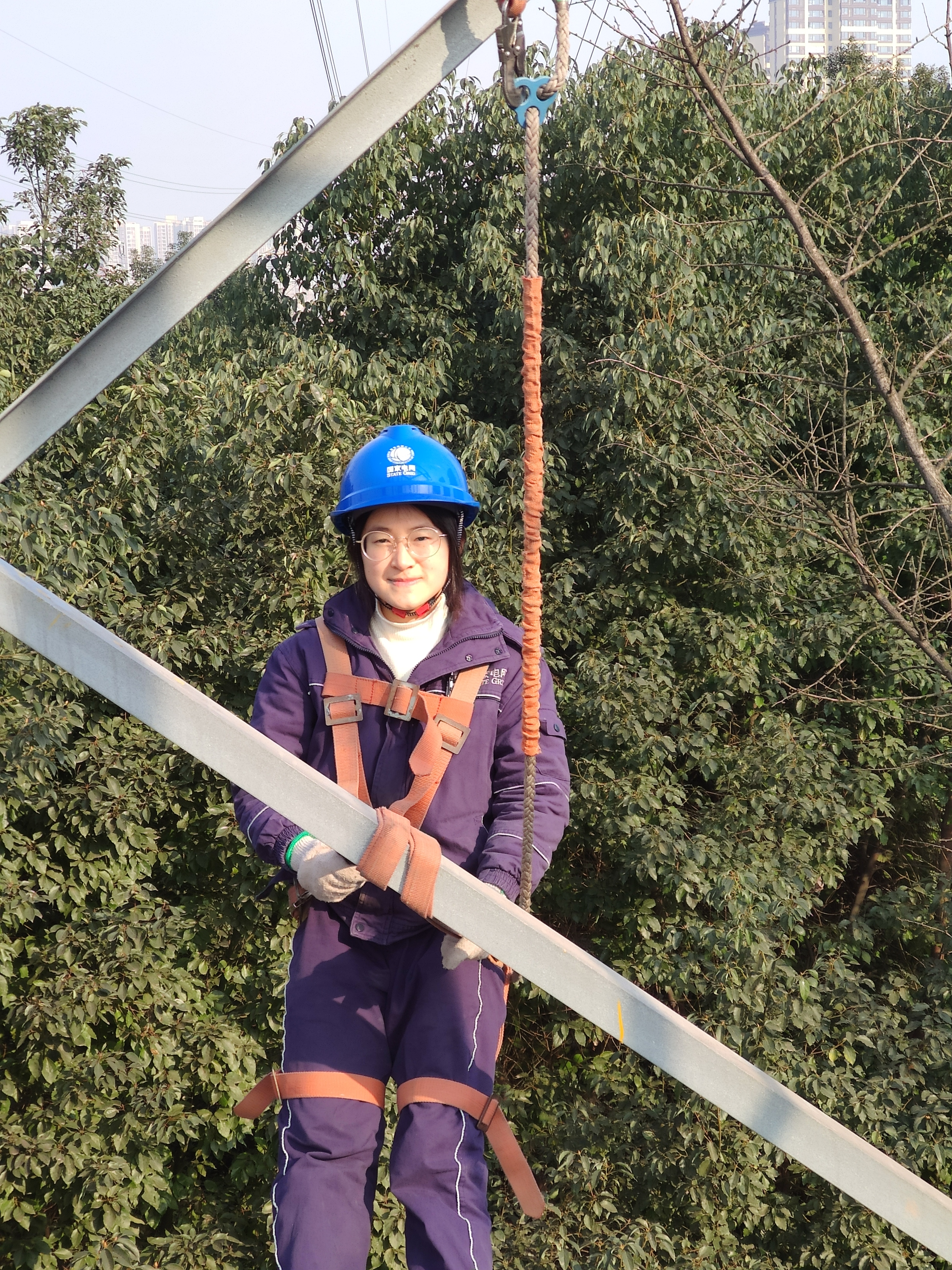 她是国网重庆璧山供电公司2020届新进大学生吕翔生,个子不高,一头干练的短发,鼻梁上架着一副眼镜,说起话来细声细语,但骨子里透着一股韧劲。“这是第一次攀爬这么高的杆塔,我心里还是很害怕,穿戴这么多装备后整个人在地面上走路都有点吃劲儿,真在想到底能爬上去吗?”回到地面的她难掩内心自豪感,“看着男同事们一个接一个地登塔,我必须要去尝试,努力做到最好,当指导老师告诉我还有6个脚钉就到横担处时,我有点不敢相信,暗暗告诉自己国家电网的女生绝不服输!”吕翔生凭着这股韧劲,最终用时5分17秒顺利完成了本次爬塔训练项目。