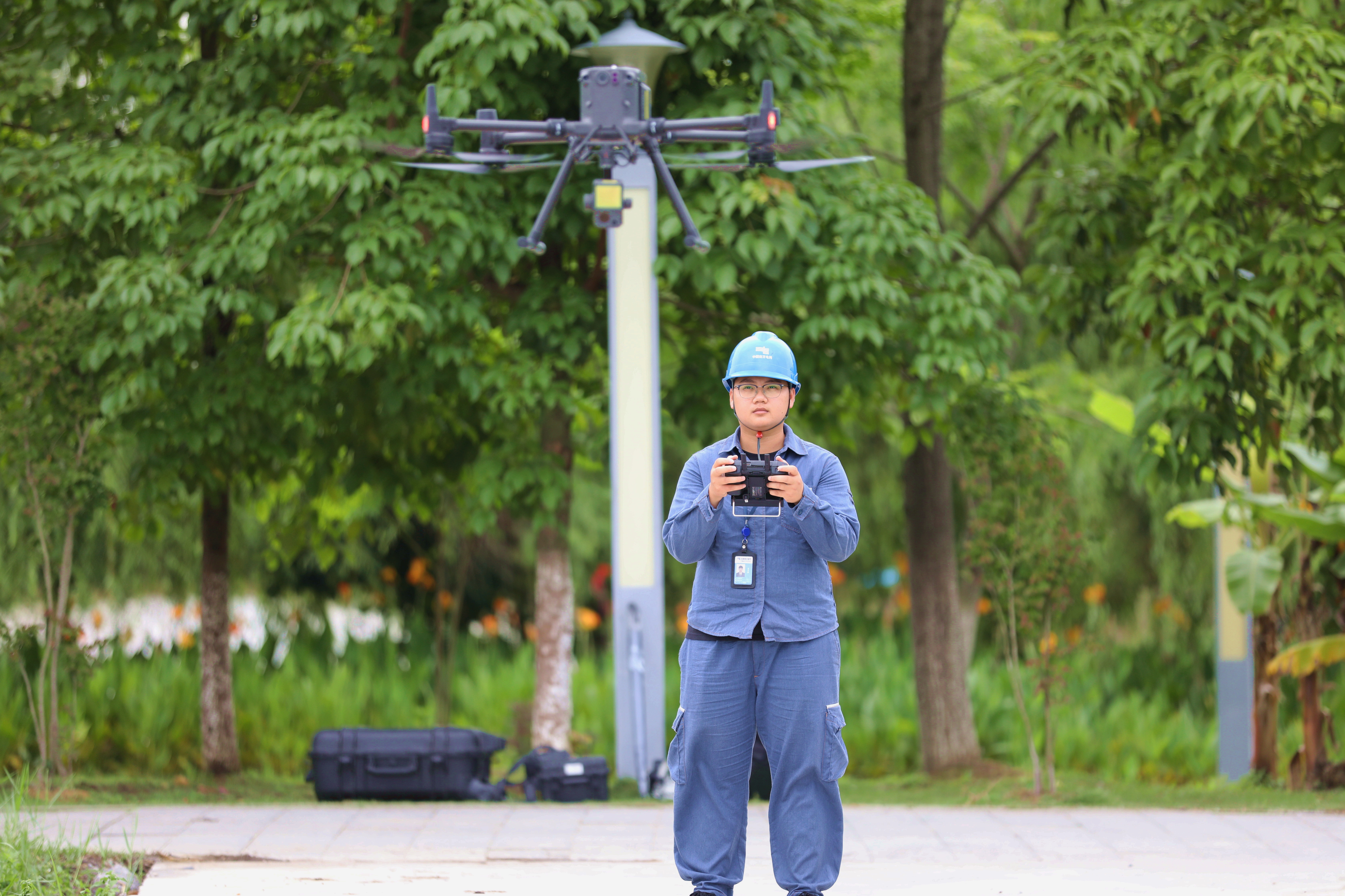 只见女孩从背包里拿出一台无人机,连接遥控器,启动电源,校准指南针······所有操作在女孩手中一气呵成。无人机稳稳起飞,向矗立在山上的电杆飞去。