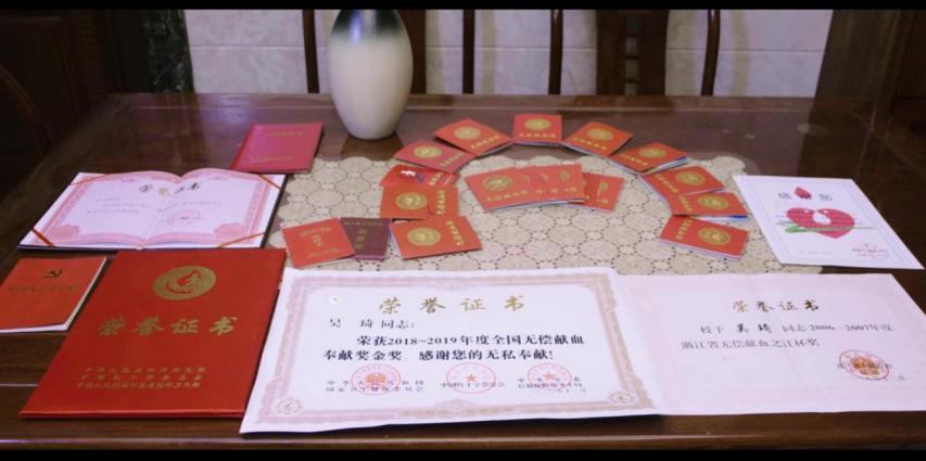22年的坚持不懈,累计献血36次,共计献血总量23700毫升,相当于5个成年人的全身血量。他先后获得“浙江省无偿献血奉献奖”“浙江省无偿献血之江杯奖”,先后三次获得“全国无偿献血奉献金奖”,并于今年获得全国无偿献血终身荣誉奖。