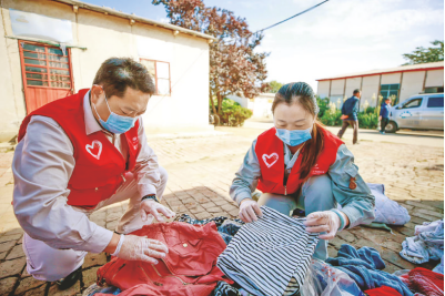 王原野(左)与志愿者一同整理捐赠的衣物。