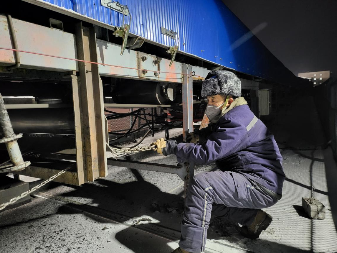 当天,室外温度已将至零下35℃,而夜间栈桥上的气温比地面还要低5~8℃。尽管裹着厚厚的劳保大衣,行进路上迎面而来的寒风,仍让田有永感到刺骨的寒意,前方不远处,他对胶带机进行调偏,很快就修整妥当。胶带机稳定运行是保障输煤系统高效安全的重要“支撑”,寒潮低温天气胶带机极易发生跑偏异常等故障,每周田有永和班组成员就要反复调整70多次。