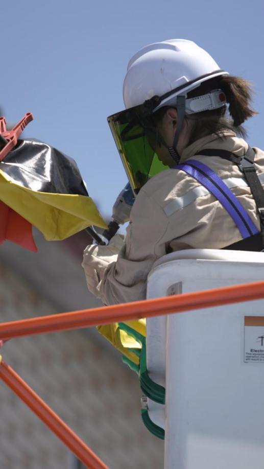 在短暂休息后,虽然汗水依然浸透全身,但谭睿却毅然表示已经准备好再次升空作业。在烈日下,她再次穿上绝缘装备,站在绝缘斗内升至高空,继续她的“战斗”。