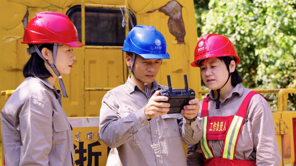 陈炜龙在山脚用无人机先行查看山顶的杆塔情况。廖敏摄