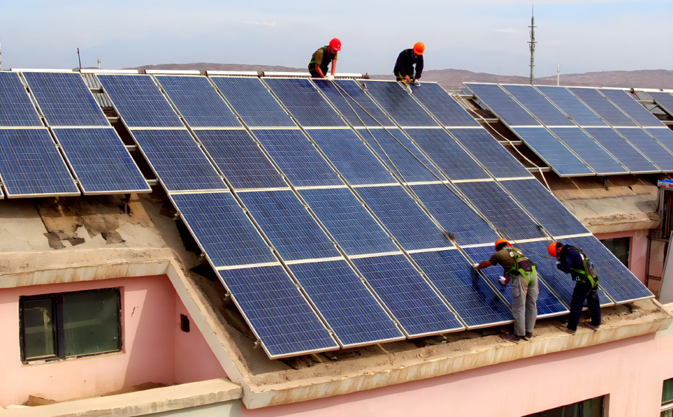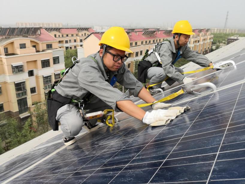 空中飞人,日常检修有高度。“太阳城”地处新疆吐鲁番市,毗邻库木塔格沙漠,全年风沙频繁,这对屋顶光伏的发电能力是一个巨大的考验。为了防止黄沙覆盖太阳能板,导致发电能力下降,老张、老黄和小王每天耗时最长的工作便是充当空中飞人,往返穿梭在293栋居民楼顶,细心清洗着37101块光伏板。