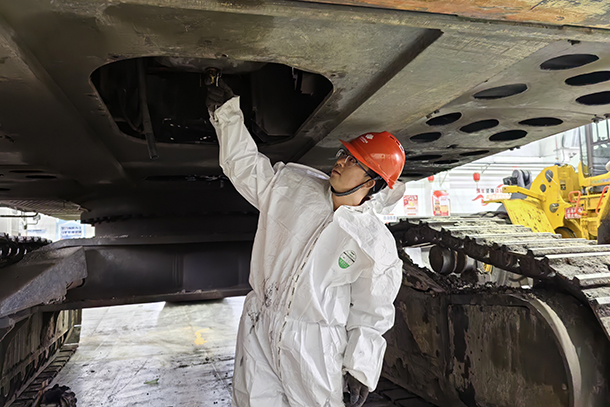 职工检查液压铲发动机漏油故障。