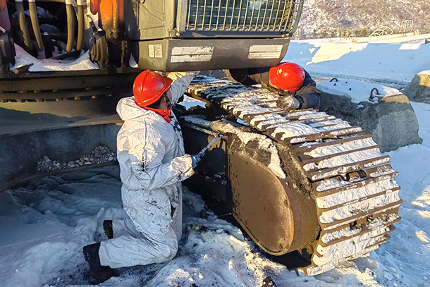 雪一直下,纷纷扬扬。下午5点,伴着暮色降临,3号TR100运输卡车后轮盘制动出现漏油故障,紧急时刻,郜普浩和兄弟们驱车前往现场抢修。由于维修盘制动是系统性检修,需要拆解后轮胎、放油、卸掉制动压力,拆卸盘制动组件和轮边减速器组件,排除故障点后,再进行回装。夜幕中,他们一个一个零件地拆卸,一个一个部件地安装,一个个忙碌的身影在夜晚灯光的映衬下显得高大起来。