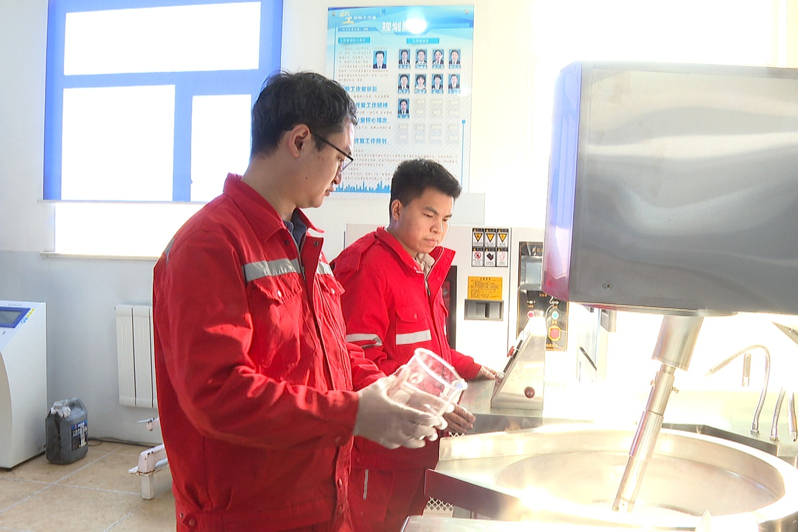 侯鹏飞和徒弟赵博宇正在进行乳胶基质黏度检测。