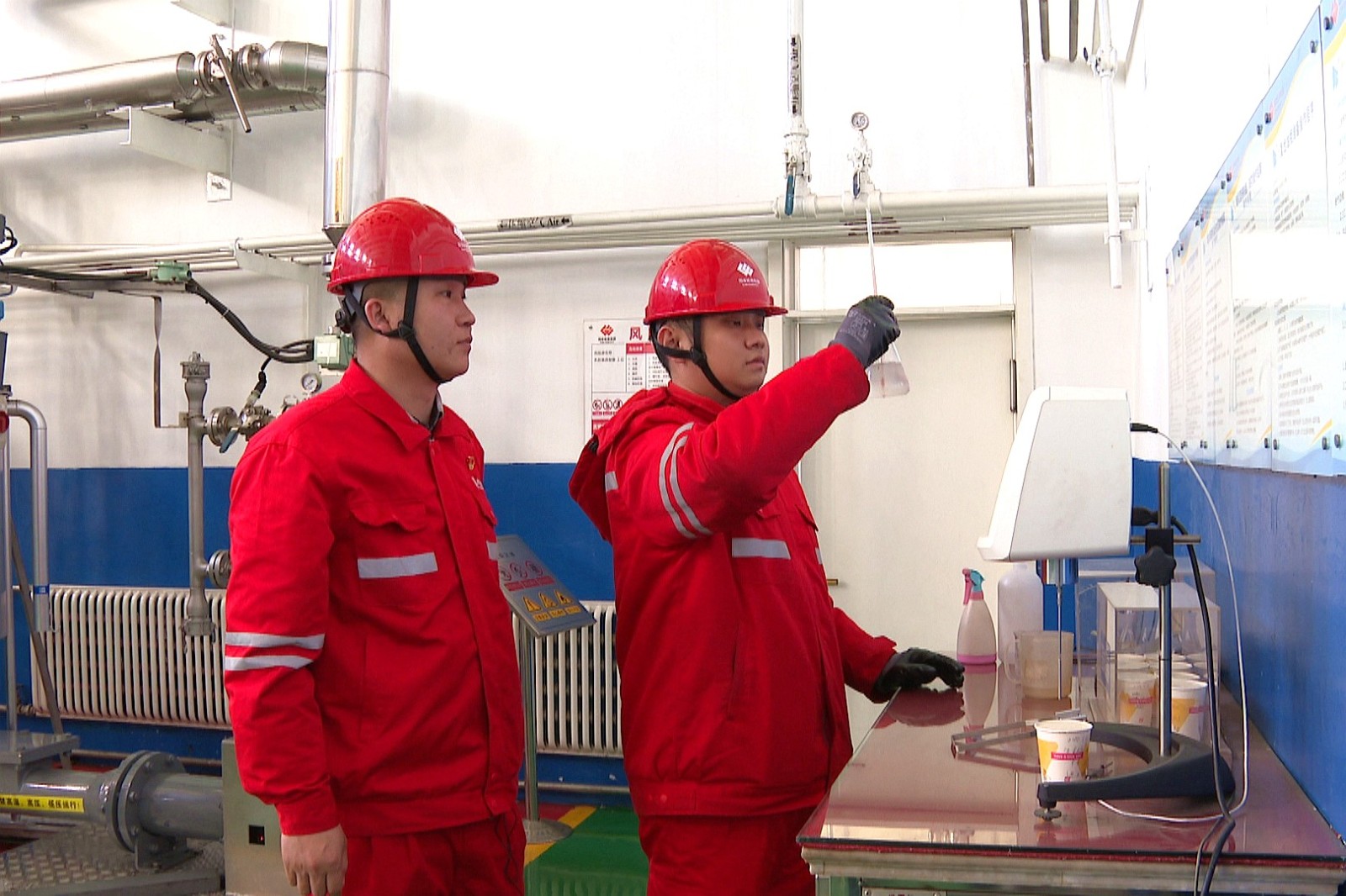 在炸药厂乳化工房内,刚入职不久的大学生赵博宇正和师傅侯鹏飞进行设备巡检。赵博宇的脸上写满了认真和专注,侯鹏飞在一旁耐心地指导。