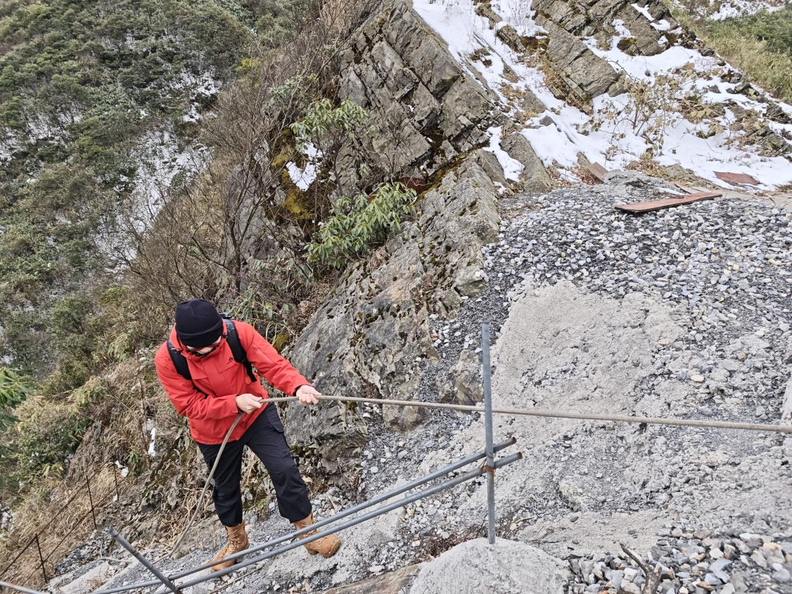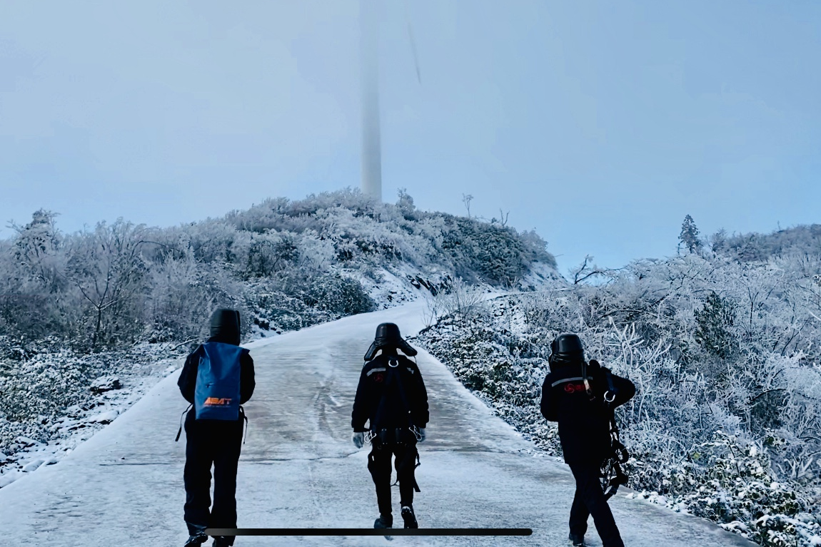 重庆新能源开发公司回山坪风电场,地处七曜山山脉“脊梁”,风电场所处之地地势险峻、海拔高耸,每到冬季更是天寒地冻。积雪覆盖着蜿蜒曲折的山路,那条通往风场值班室的“大道”,因结冰严重人车均无法通行。早在1月26日,王万祥等一行春节值守人员便毅然踏上了上山的攀爬之路。这条上山的小径十分险峻,四周被大雪覆盖,杂草肆意丛生,荆棘密密麻麻遍布期间。他们仅靠着一根登山棍、一双冰爪,在这艰难的小路上艰难前行,在狭窄陡峭的石壁上奋力攀爬。