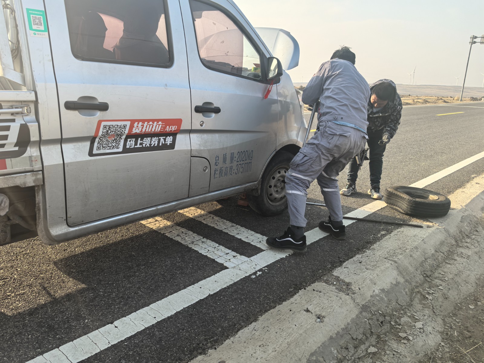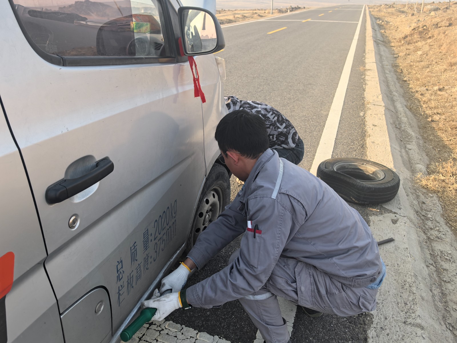 “印科,先设三脚架!”卫燕鹏的提醒与风声同时抵达。张印科逆着车流奔出大约一百五十米,将醒目的三角警示牌稳稳放置在路面中央,在雪地里划出安全半径。折返时,卫燕鹏正单膝跪地检查轮毂:“锈死了,得用套筒扳手。”“您别着急,我们联系站内送工具过来。”他一边安慰刘师傅,一边掏出手机给检修班长郭怡伦打去电话:“郭班长,我们的巡检任务已经完成,返场途中走到炕塄村后面600米处有社会车辆爆胎,司机师傅随车工具损坏,我们需要千斤顶和21号套筒扳手。”电话里传来清晰而坚定地回应:“你们注意现场安全,我马上携带工具过来。”挂断电话后,时间仿佛过得飞快。