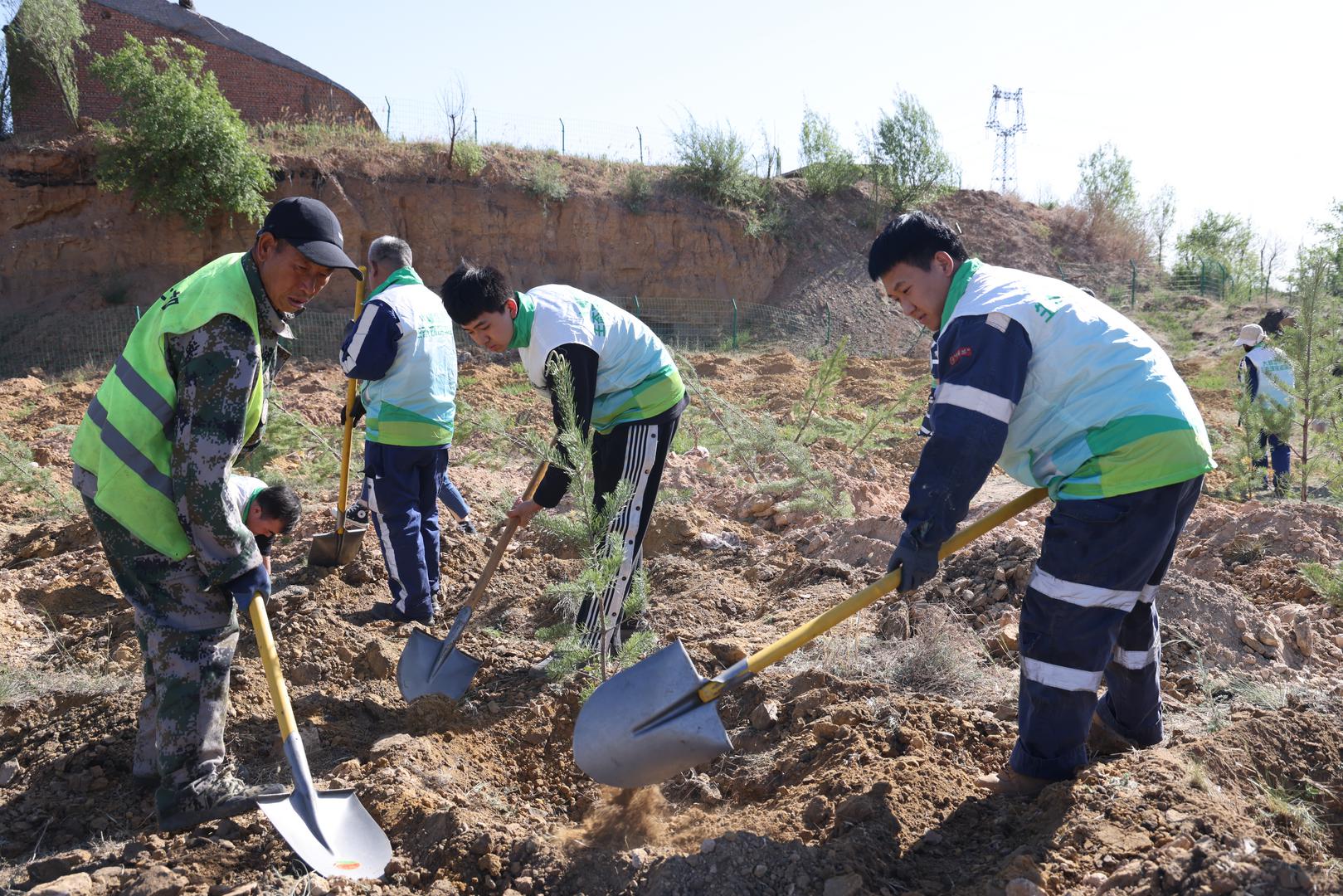 大柳塔煤矿职工开展义务植树活动。