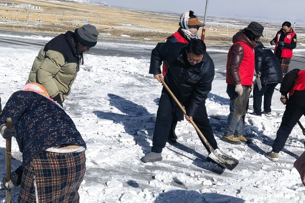普布多吉带领党员志愿者清理辖区道路结冰路面。