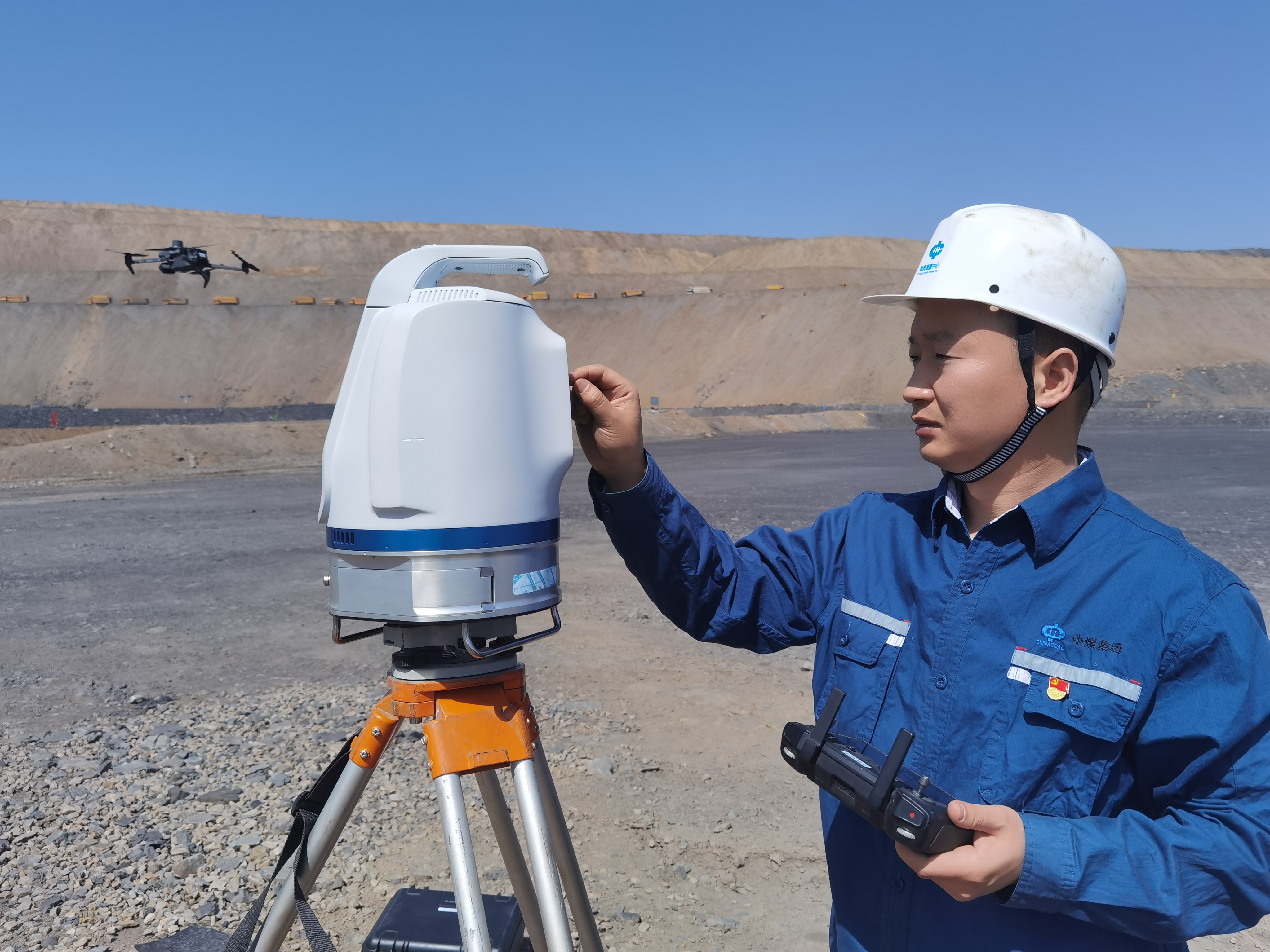葛山峰使用扫描仪+无人机进行测量作业。