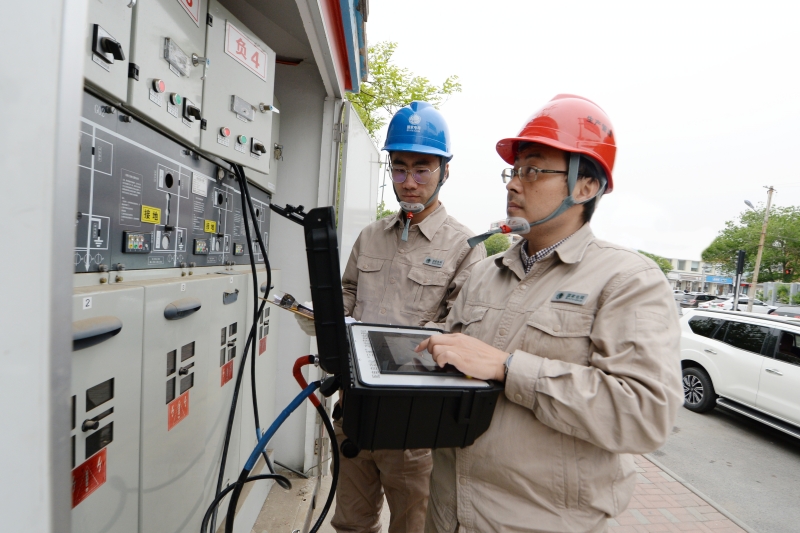 黄旭(右一)运用配电自动化“三遥”功能带电检测仪,对开关柜进行自动检测。