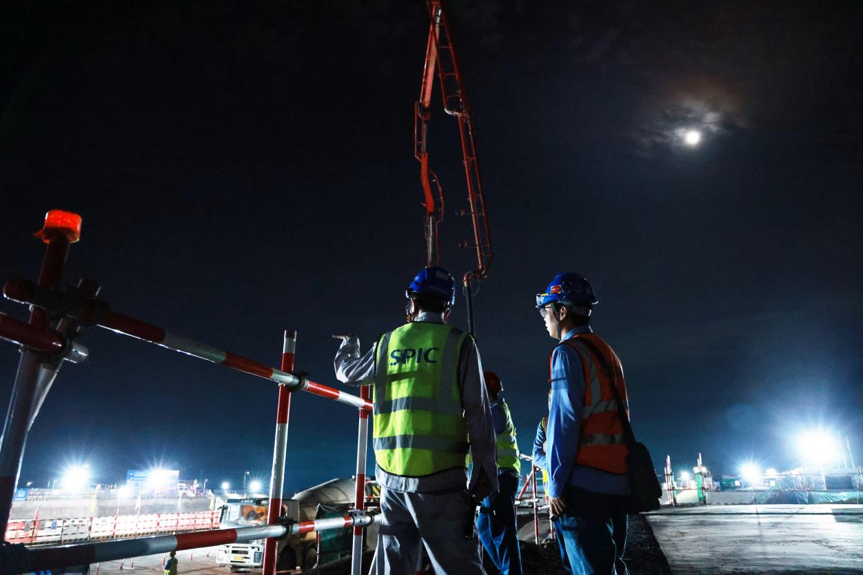 周阳正在查看核岛基坑垫层浇筑(左一)。