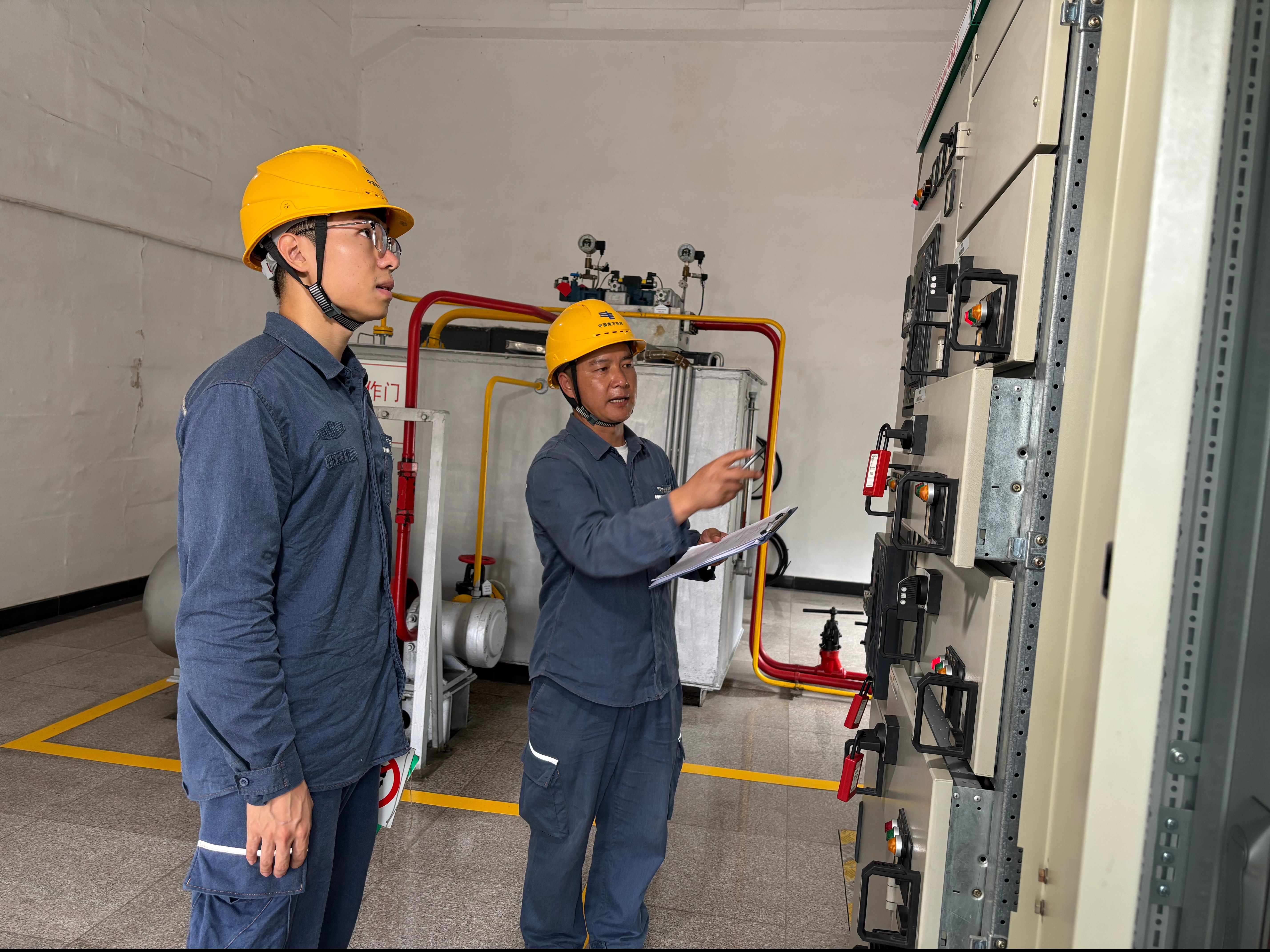 “传帮带”带领新员工学习闸门系统电气设备,右为周政坤。何莉英 摄