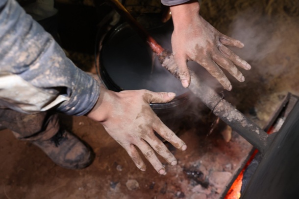 推开作业点临时搭建的彩钢房门,钻探工孙春利正背对着门,弓着身子,把一双通红肿胀的手拢在嘴边,不停地呵气揉搓。听到动静,他缓缓转过身来——屋里光线昏暗,仅有的一盏灯在他脸上投下深深浅浅的影。脸上的泥浆在他颧骨处凝成深色的斑块,眼睫毛上还挂着未化的冰晶。