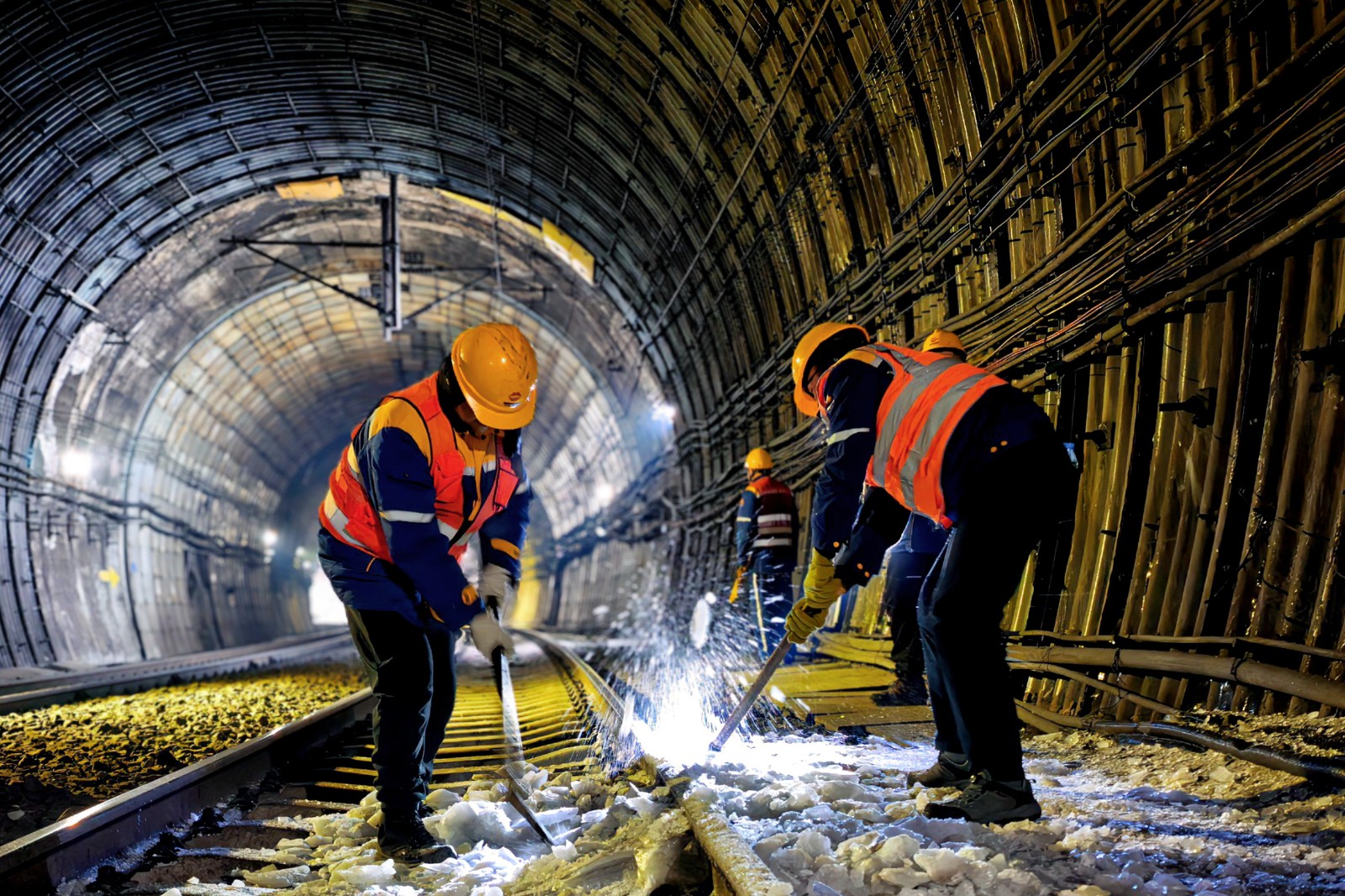 “必须在天窗点内清除,一刻不能等!”线路工区刘忠一声令下,带着五名年轻职工火速奔赴现场。零下十几度的隧道内寒风刺骨,岩壁渗水不断滴落,冰水顺着衣领、袖口往里灌,刺骨寒意瞬间浸透工装。