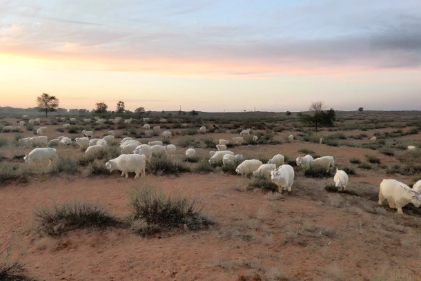 图为宁夏盐池县营盘台村的羊在广袤草原上自由觅食