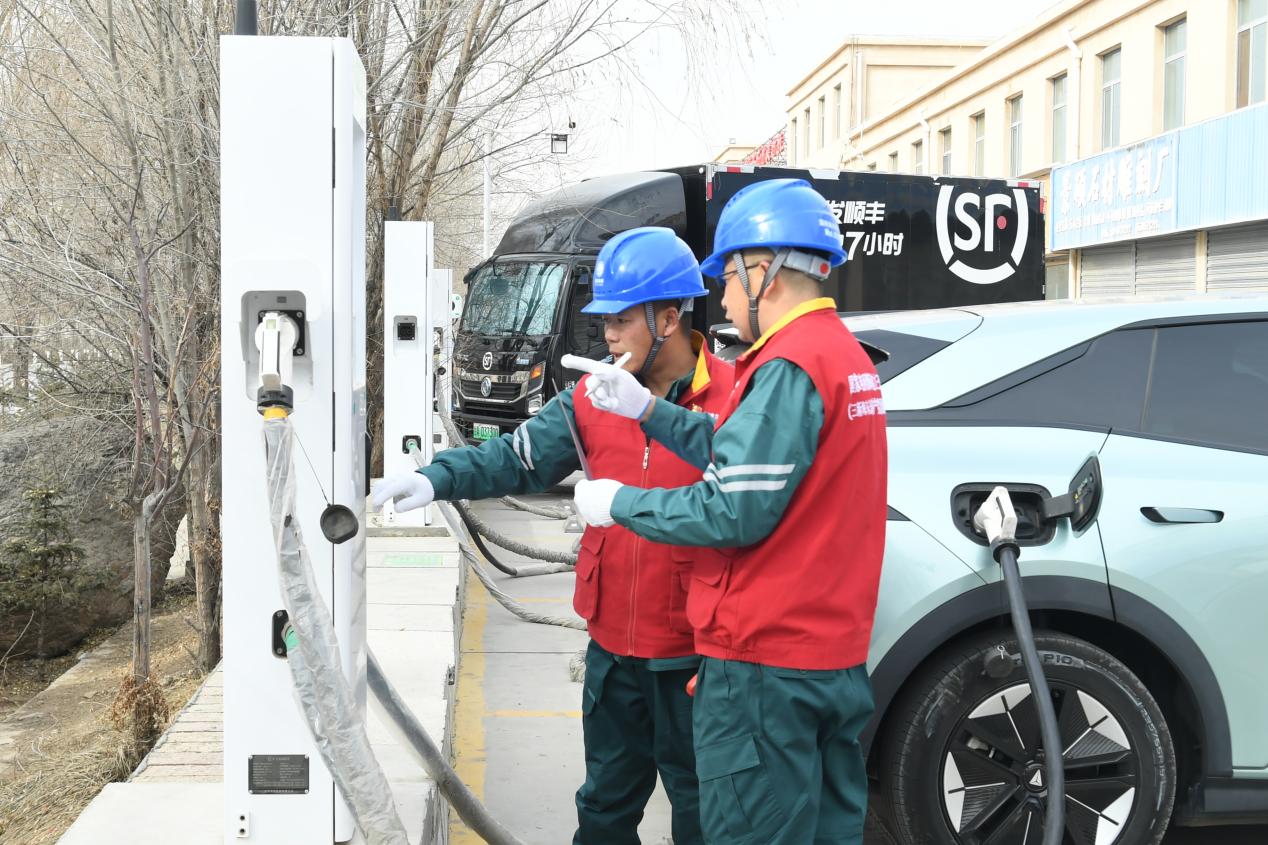 国网海东供电公司高寨供电所员工在电动汽车充电站排查用电隐患。李永鹏 摄