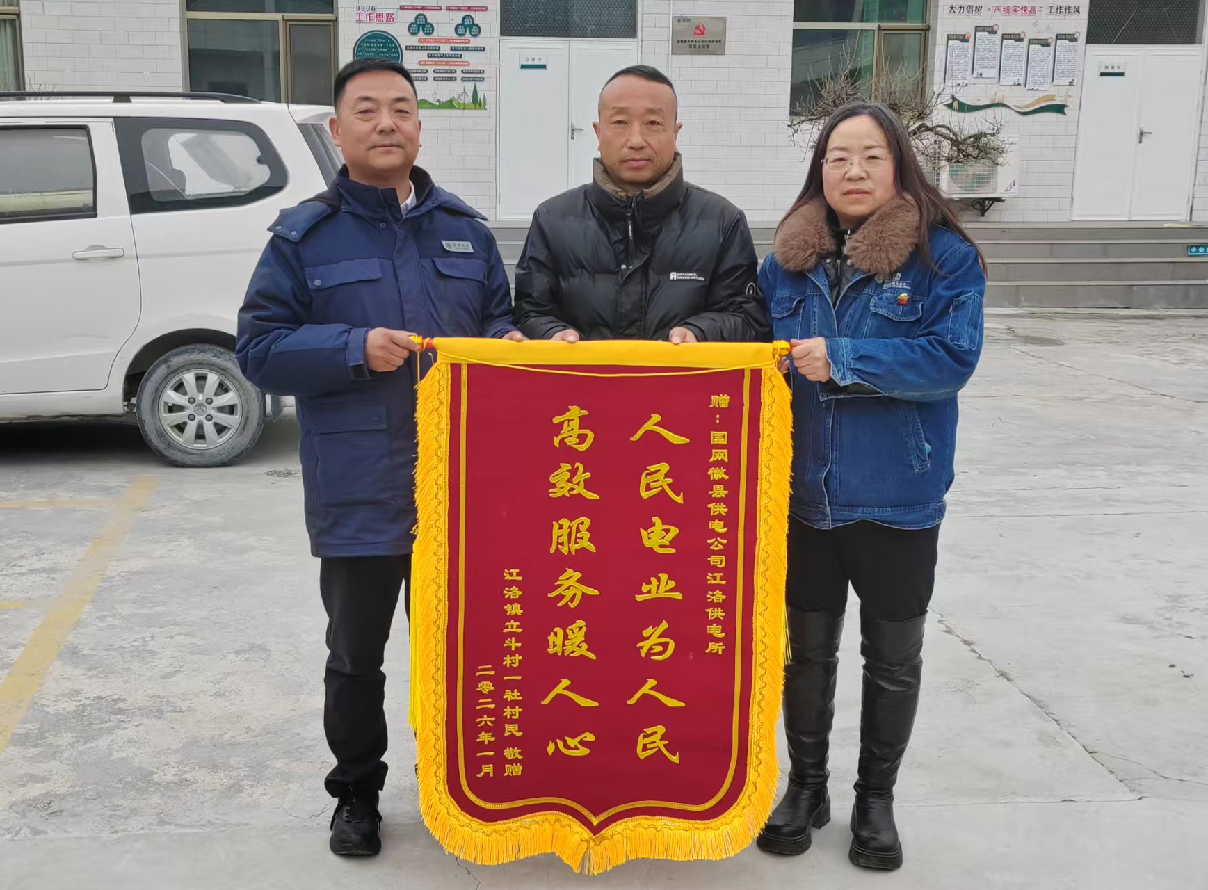 中国能源新闻网讯(任毅明 马志飞)一面锦旗传谢意,一份认可励前行。1月26日,国网甘肃徽县供电公司(简称“国网徽县供电”)江洛供电所收到立斗村村民镡小勇送来的锦旗,旗面“人民电业为人民,高效服务暖人心”14个烫金大字格外醒目,这是用户对台区经理陈新军、刘江平快速处置用电故障,高效保障民生用电的诚挚肯定与衷心感谢。