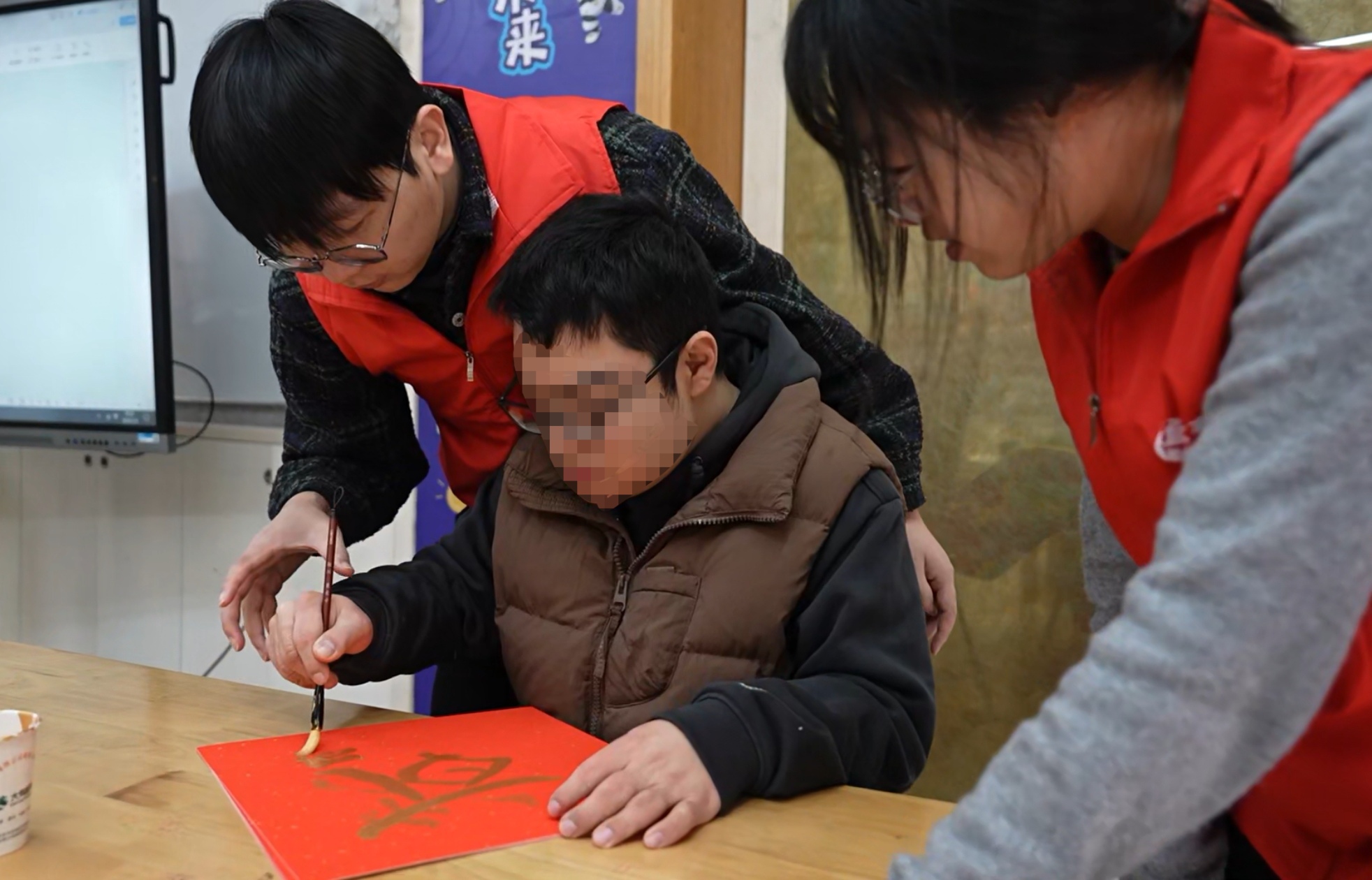 活动过程中,志愿者们始终陪伴在孩子们身边,认真倾听他们的声音,分享他们的喜悦。写“福”字、展示作品、合影留念……欢声笑语充满了整个教室,孩子们的脸上绽放出灿烂的笑容。