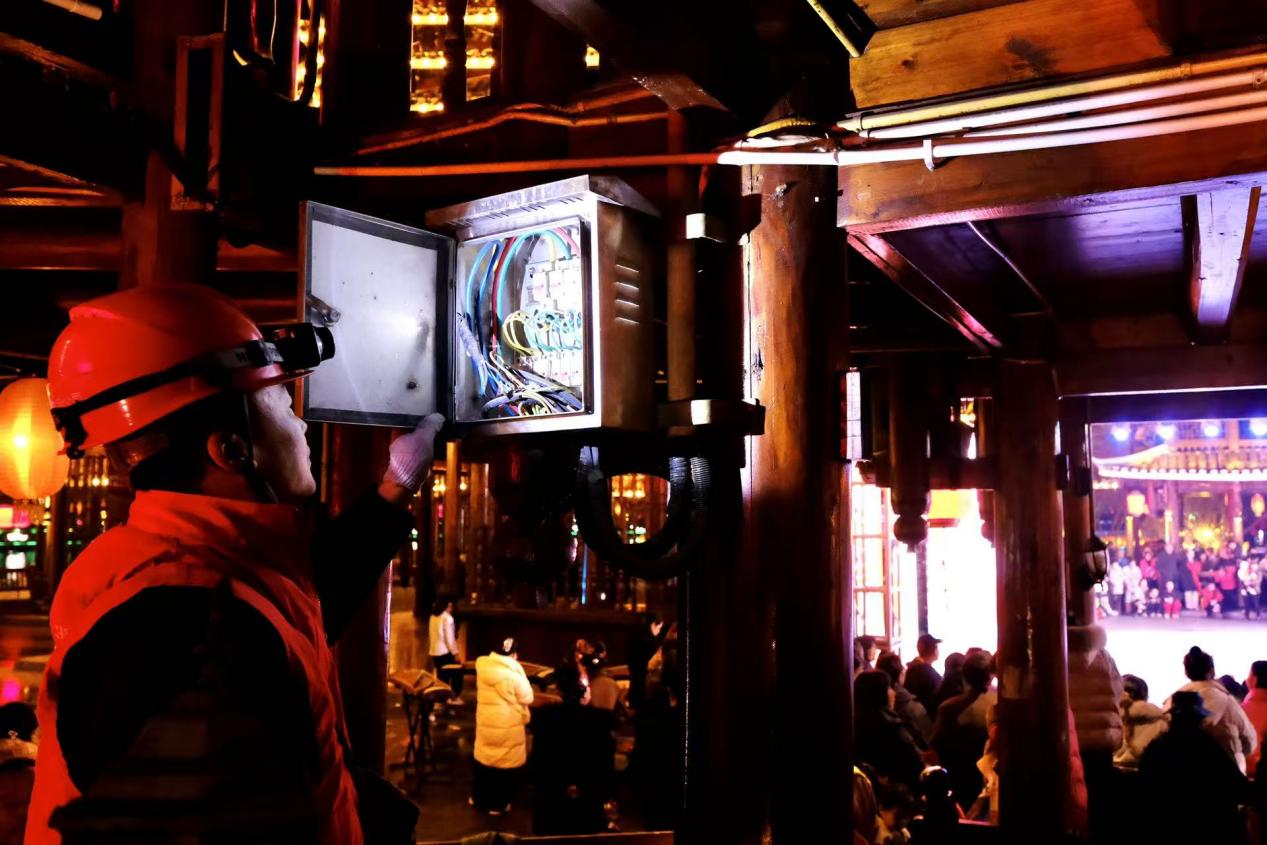不远处的飞虎风情街也是人头攒动。“湘遇非遗·沅州云集”市集内,非遗展示与年货展销吸引了大量游客。为保障街区灯笼、灯带及特色商铺的稳定用电,该公司增派了保电人员驻守现场,随时应对突发情况。