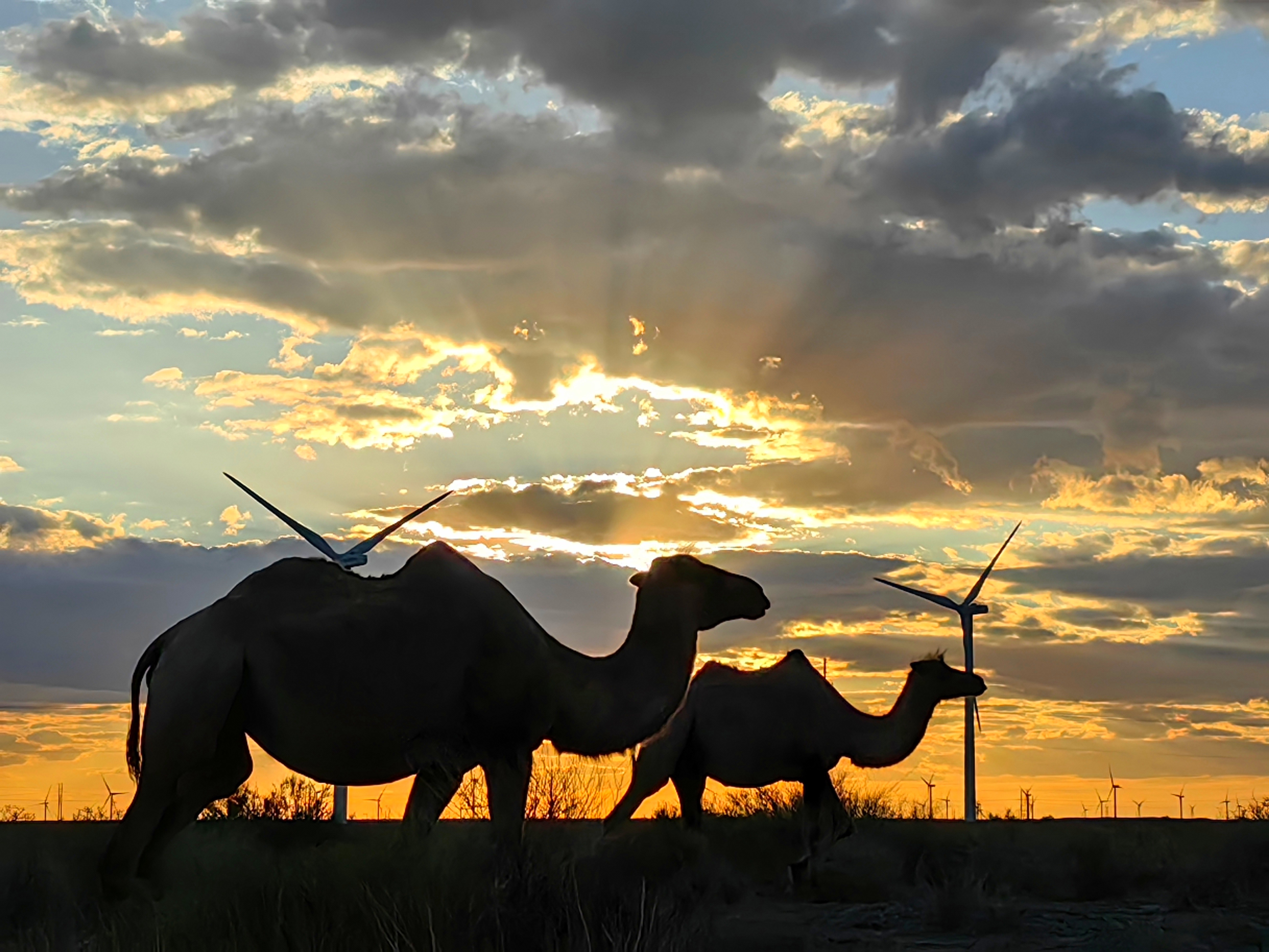 图为畅游在酒泉风场风机丛中的骆驼