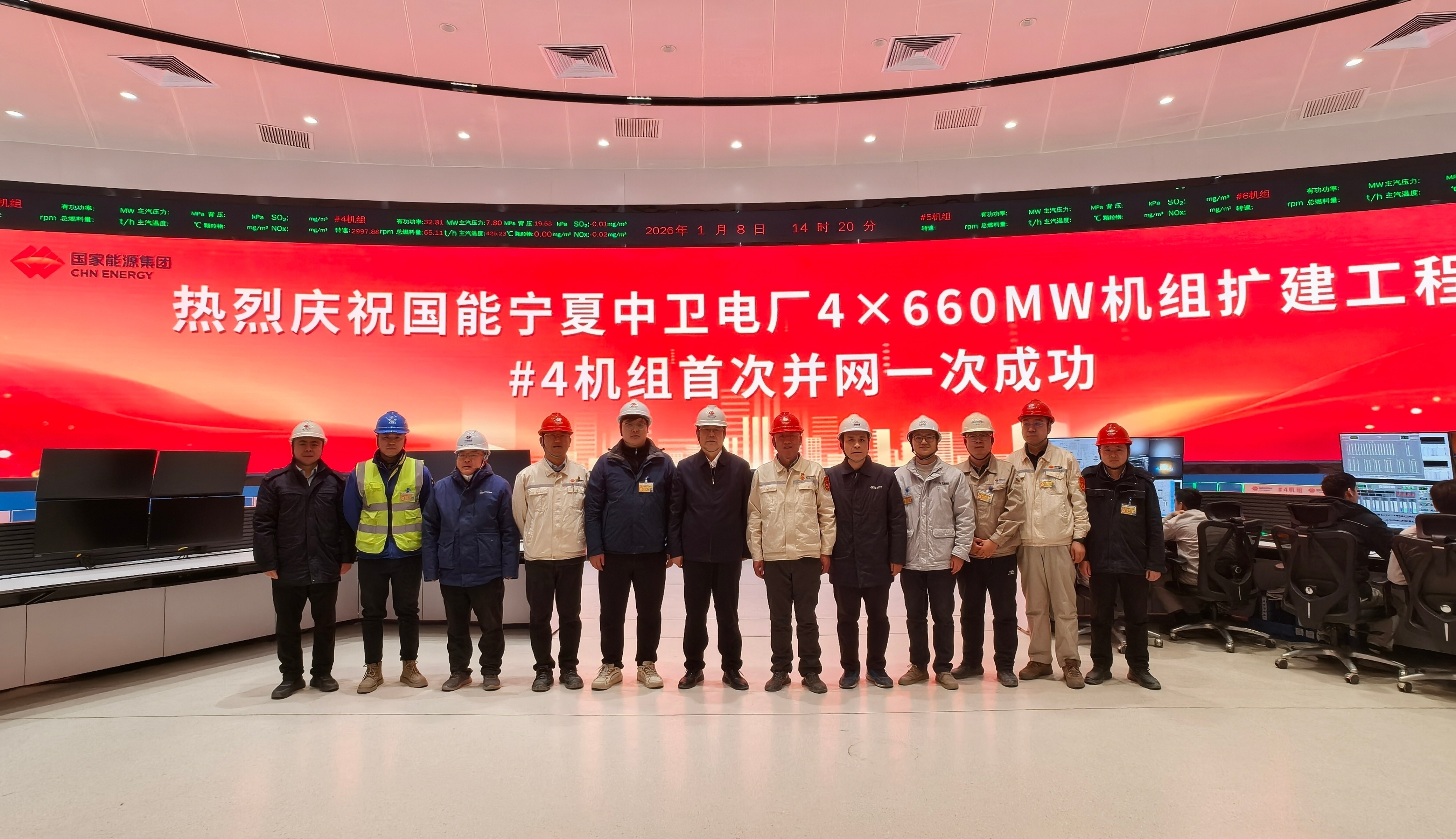14时20分,伴随着屏幕上的倒计时归零,中国电建集团核电工程有限公司(以下简称“电建核电公司”)承建的中卫项目4号机组首次并网一次成功,机组各系统运行平稳,主要参数指标优良,标志着“宁湘直流”核心配套调峰电源及全国首批“沙戈荒”光基地配套火电项目正式接入电网,具备了对外供电的能力,为后续进行168小时满负荷试运行及投产发电奠定了坚实基础。