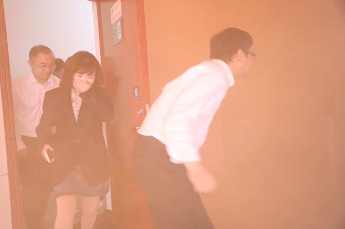 “楼内人员,请从最近的安全出口撤离······”随着烟雾的弥漫,曲靖供电局办公大楼内响起了警报和撤离提示,防火卷帘降下,各个办公室内人员捂住口鼻从安全通道快速地往安全区域疏散。随后紧急救护小组对被困人员和受伤人员进行了紧急救援,并第一时间开展伤口包扎、心肺复苏等救治演示,整个过程迅速流畅。
