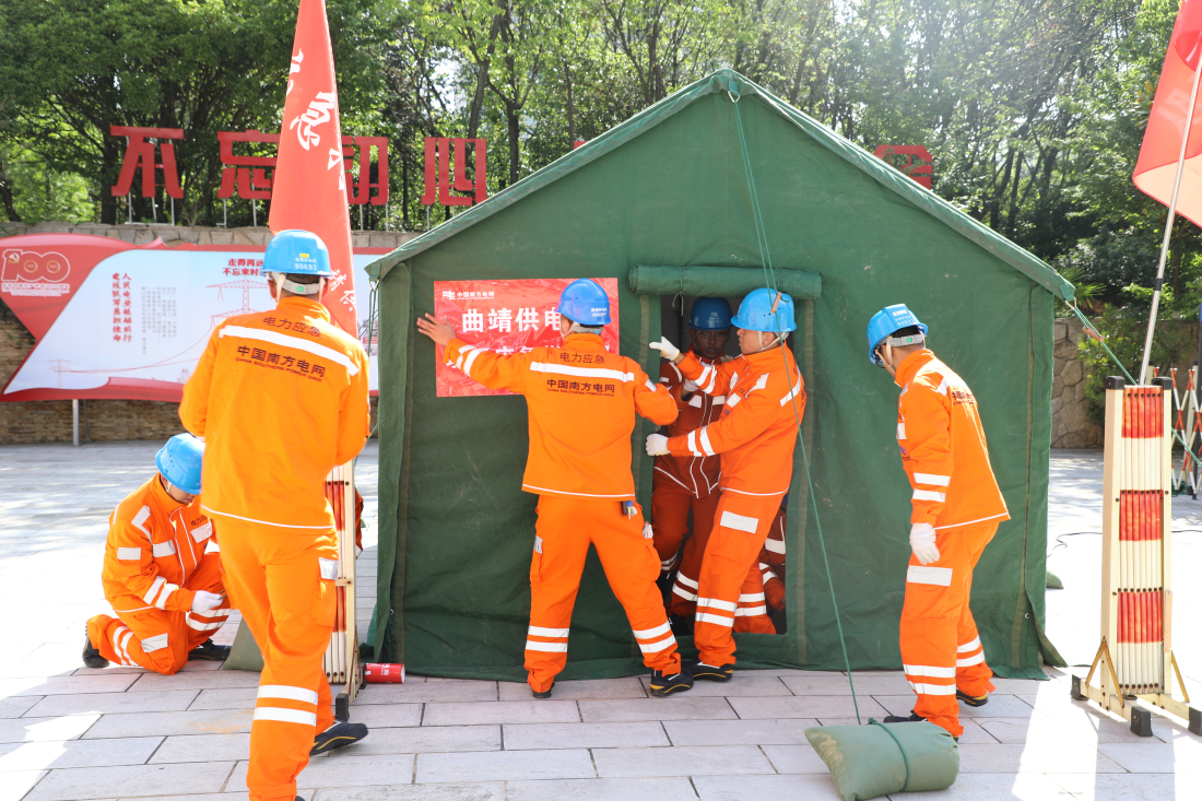 用无人机查勘灾情、搭建帐篷、启动应急发电机、铺设线路······在转移后的安全区域,曲靖供电局特勤队搭建了现场应急指挥部。从搬运物资到点亮灾区“第一盏灯”,仅用时10分钟。特勤队队员们分工明确、训练有素,为抗震救灾赢得宝贵的时间。